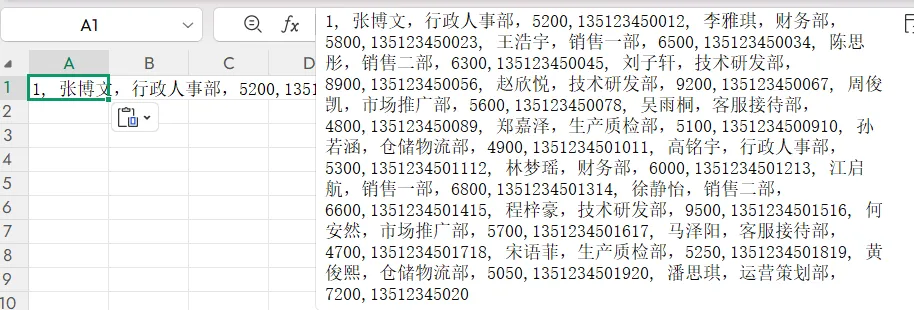 先将数据复制到Excel表格,如图会将所有的数据都复制到同一个单元格里