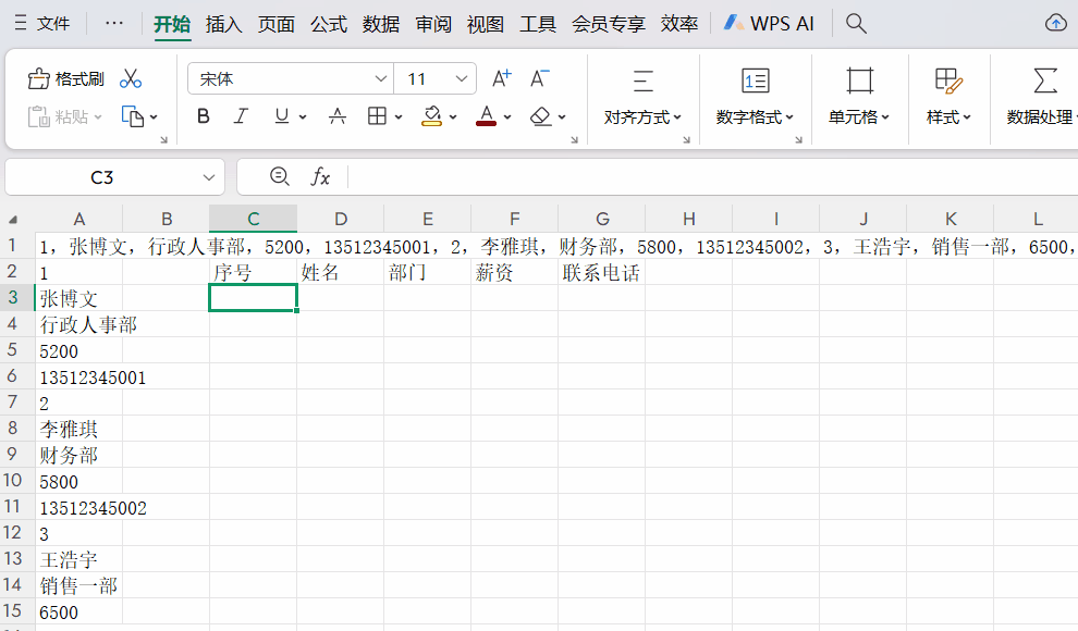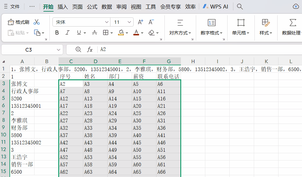 这时用WPS中的TEXTSPLIT函数来处理,输入公式=TEXTSPLIT(A1,,”,”),将表格修拆分成1列数据