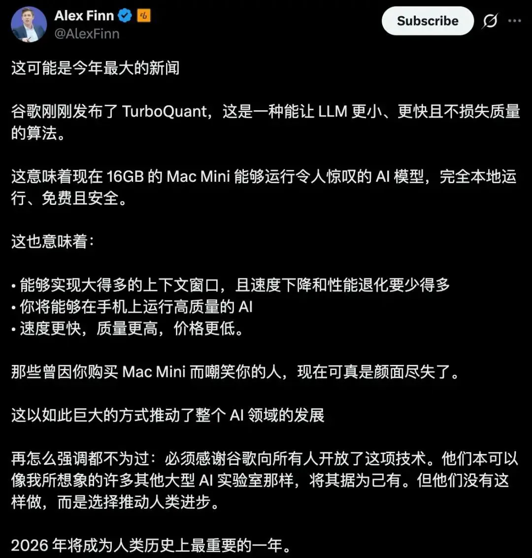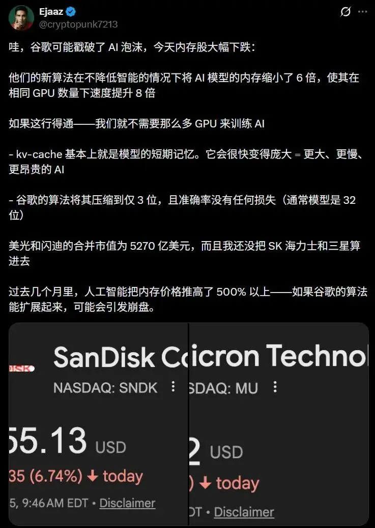 [美光、西数集体暴跌,只因谷歌发了一篇名为 TurboQuant 的论文。这张纸把AI推理的内存需求猛砍了6倍,计算速度却飙了8倍。谷歌用数学魔术告诉全世界:昂贵的硬件稀缺性,在聪明的算法面前一文不值。]