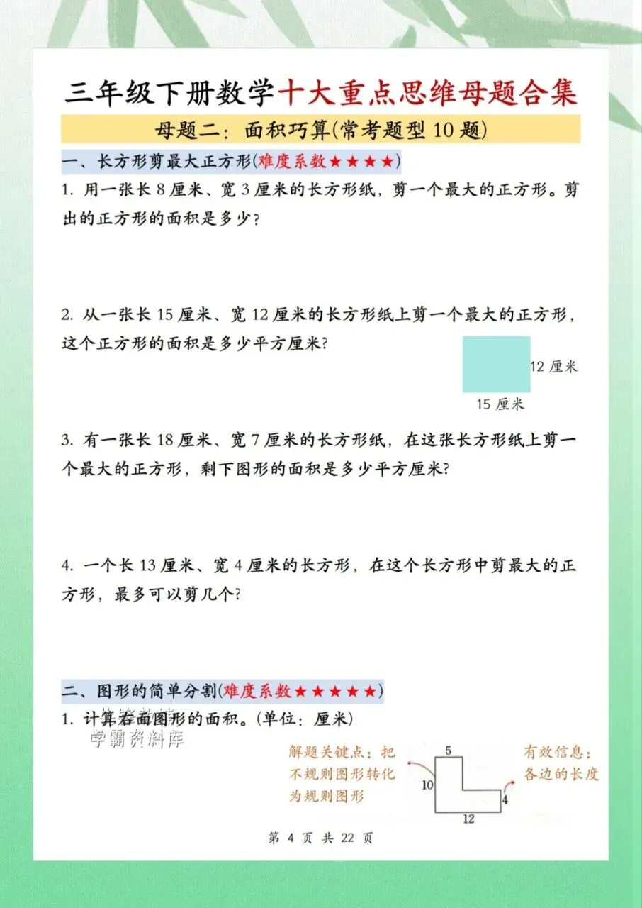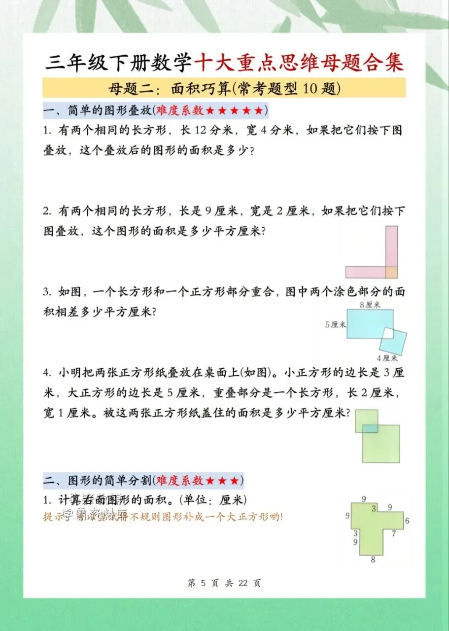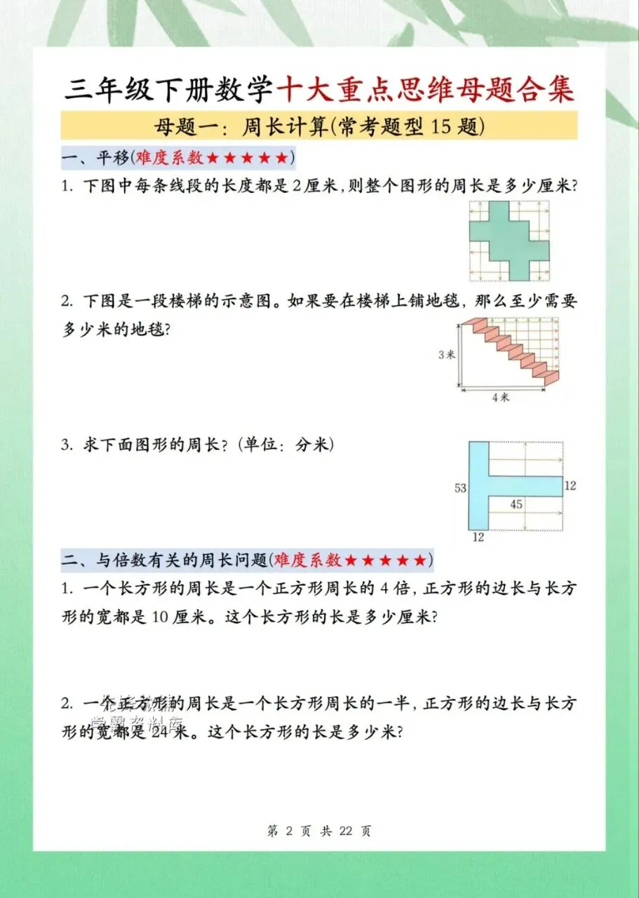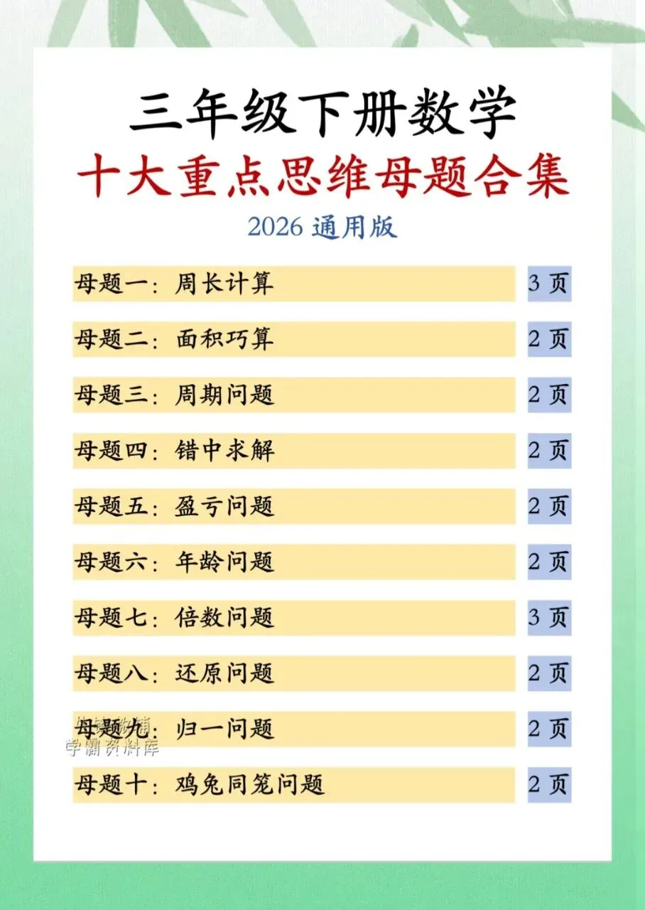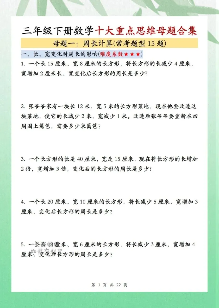 今日分享三年级下册数学十重大点思维母题合集共计 22 页。思维母题合集知识点汇总包含了周长计算、面积巧算、周期问题等内容。需要的家长抓紧打印出来,让孩子在利用课余学一学、背一背,扎实基础。