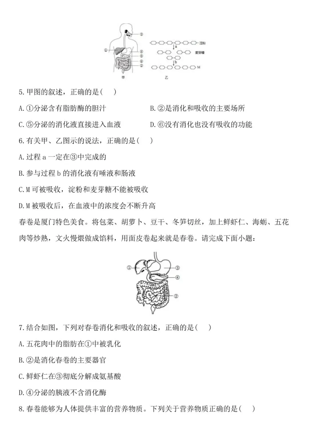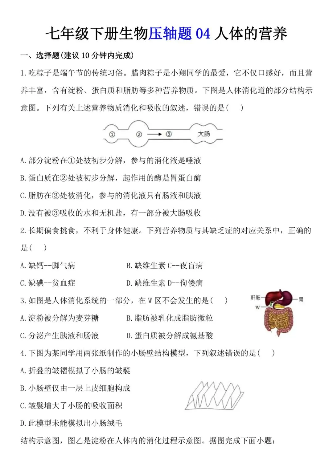 七年级下册生物压轴题 04 人体的营养电子版可打印