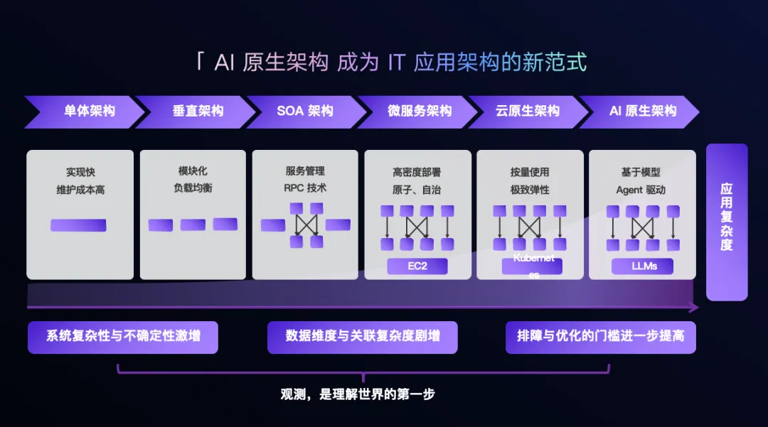 随着技术架构从微服务、云原生演进至 AI 原生(AI-Native),系统的复杂性与不确定性正呈指数级增长。观测云的分享中指出,AI 原生架构不仅是模型的堆叠,更是以 Agent 驱动、基于模型构建的新范式。在这一背景下,数据维度与关联复杂度的剧增,使得传统的监控手段难以支撑排障与优化需求。