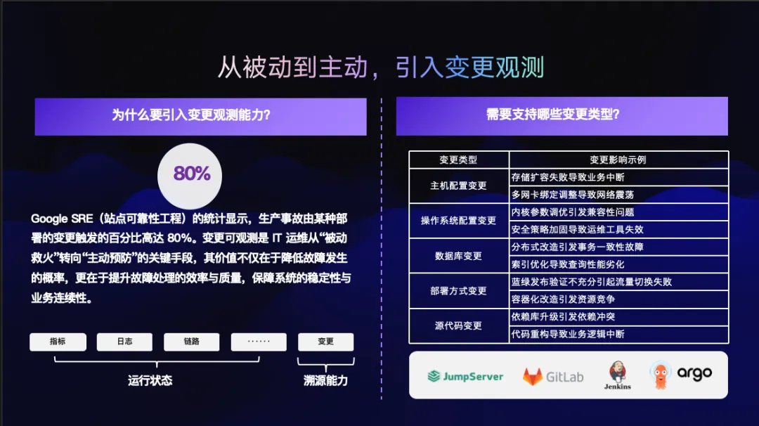 统计显示,约 80% 的生产事故由部署变更触发。观测云通过引入变更观测能力,将 IT 运维从“被动救火”转向“主动预防”,帮助企业精准捕捉配置错误、代码发布等关键变量,大幅缩短故障定位时间(MTTD)。
