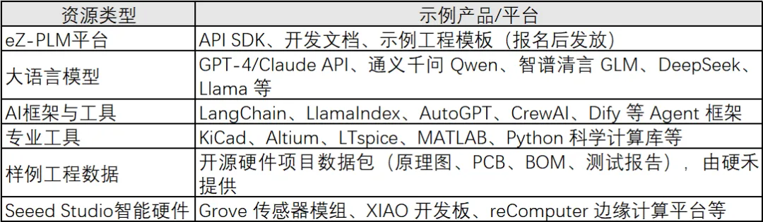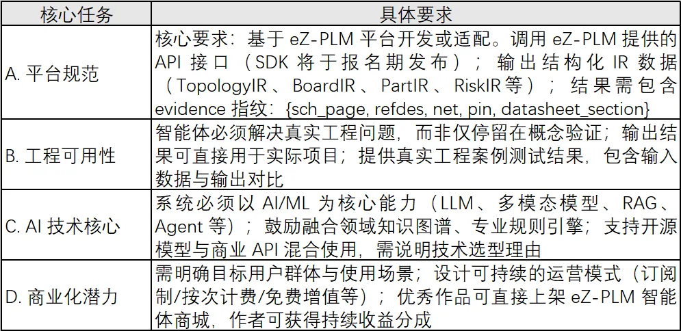 本赛题鼓励参赛队伍基于硬禾科技旗下的 eZ-PLM 平台,设计并实现面向电子工程全链条的 AI 智能体工具。智能体需具备产业级可用性,优秀作品可直接上架 eZ-PLM 智能体商城,持续服务真实用户并产生收益。
