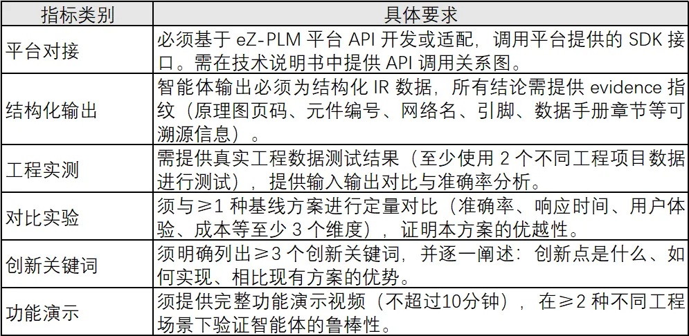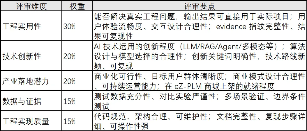 说明:“工程实用性”是本赛题的核心特征与第一评审要素。评审将优先考虑智能体能否解决真实工程问题,同时兼顾技术创新性与产业落地潜力。相同技术水平下,解决的工程问题越真实、越复杂、越有价值,得分越高。