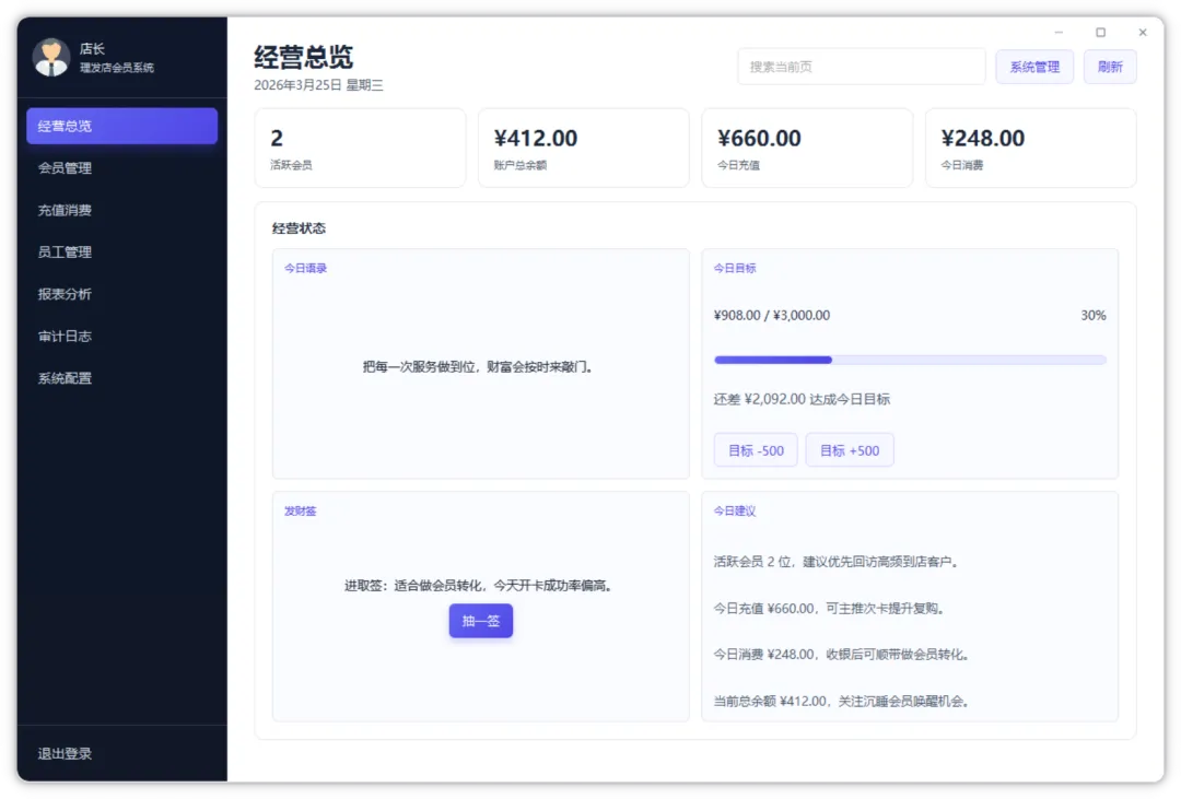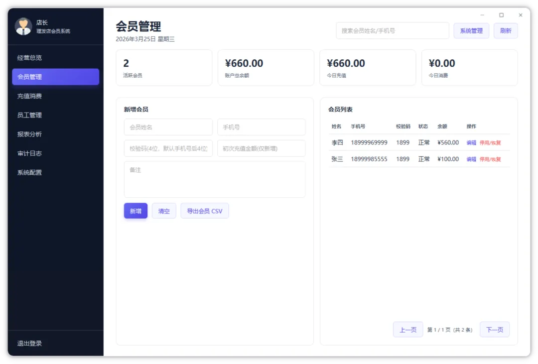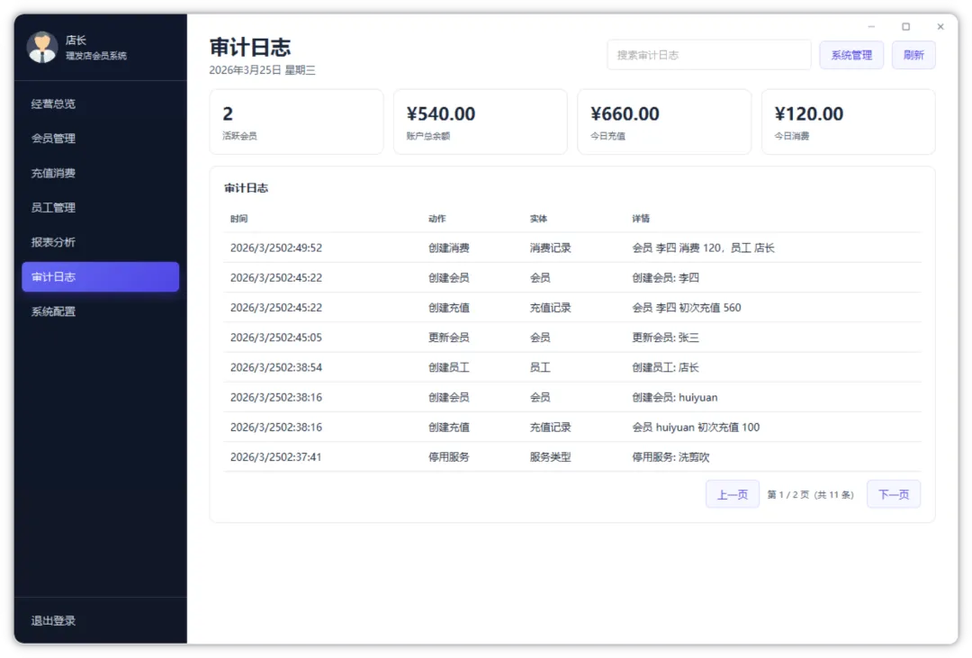 软件采用 Vue 3 + Spring Boot + SQLite 的组合,不依赖外部数据库,支持店长注册登录、会员管理、充值与消费记录、员工与服务管理、经营统计和审计日志等功能,以后就可以轻松查看每日营业和会员消费信息了,比起之前的那种纸质会员抄写方式效率提升不知道多少。