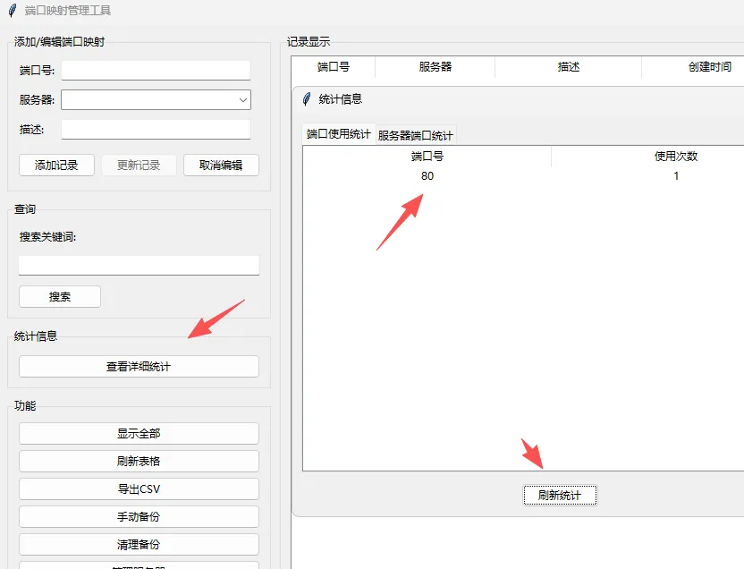 比如我这边要添加一个80描述,再加添加记录即可。添加成功,这边有一个详细信息,服务器端口统计可以能看到了,它可以手动备份清除备份办理服务器也可以显示全部。这边是我们添加的端口号,这样子查询起来,嗯,非常的方便服务器。