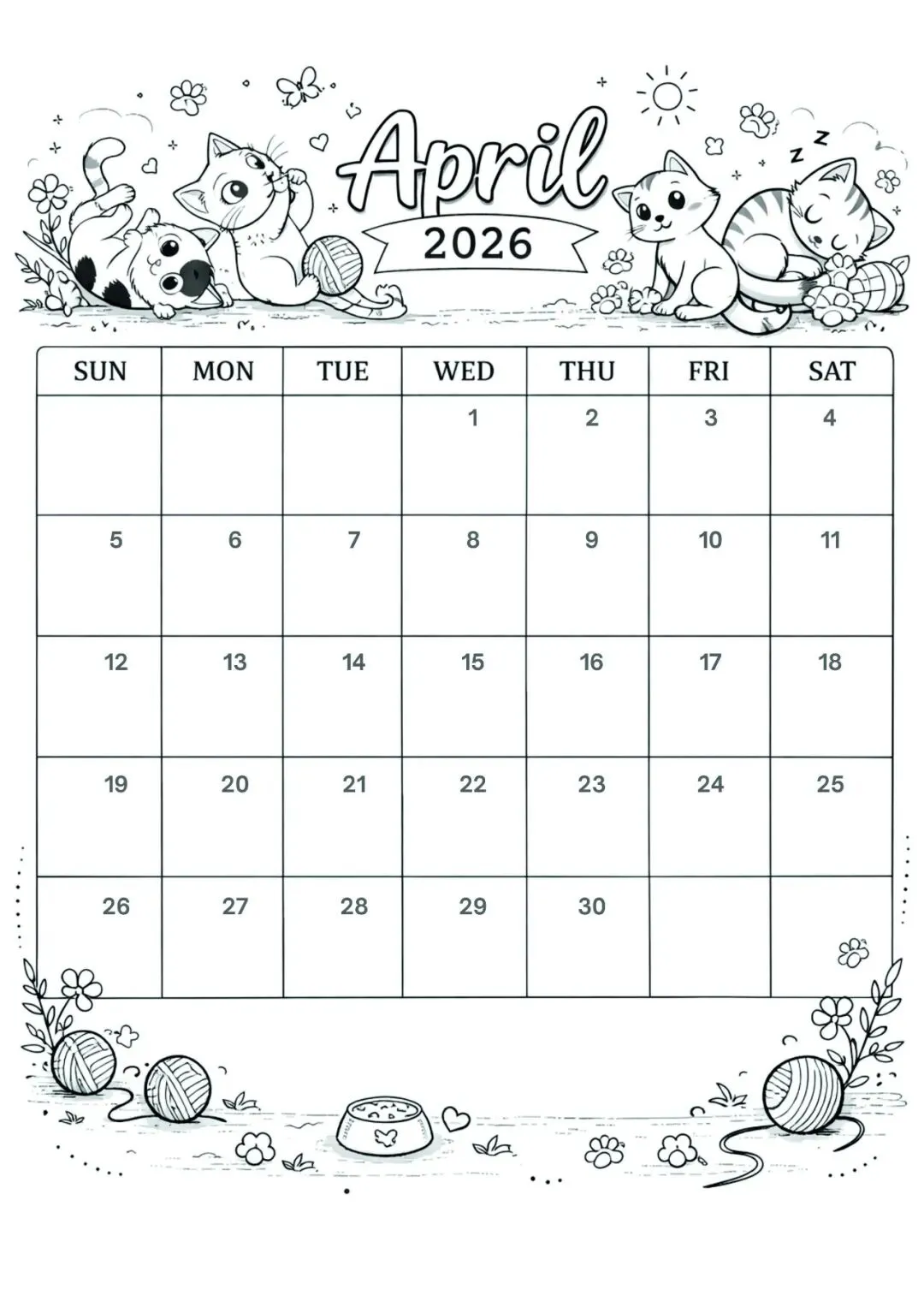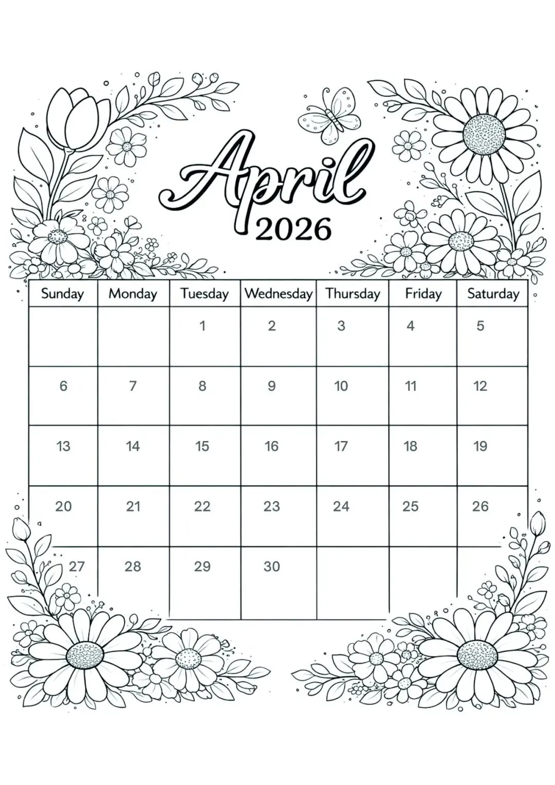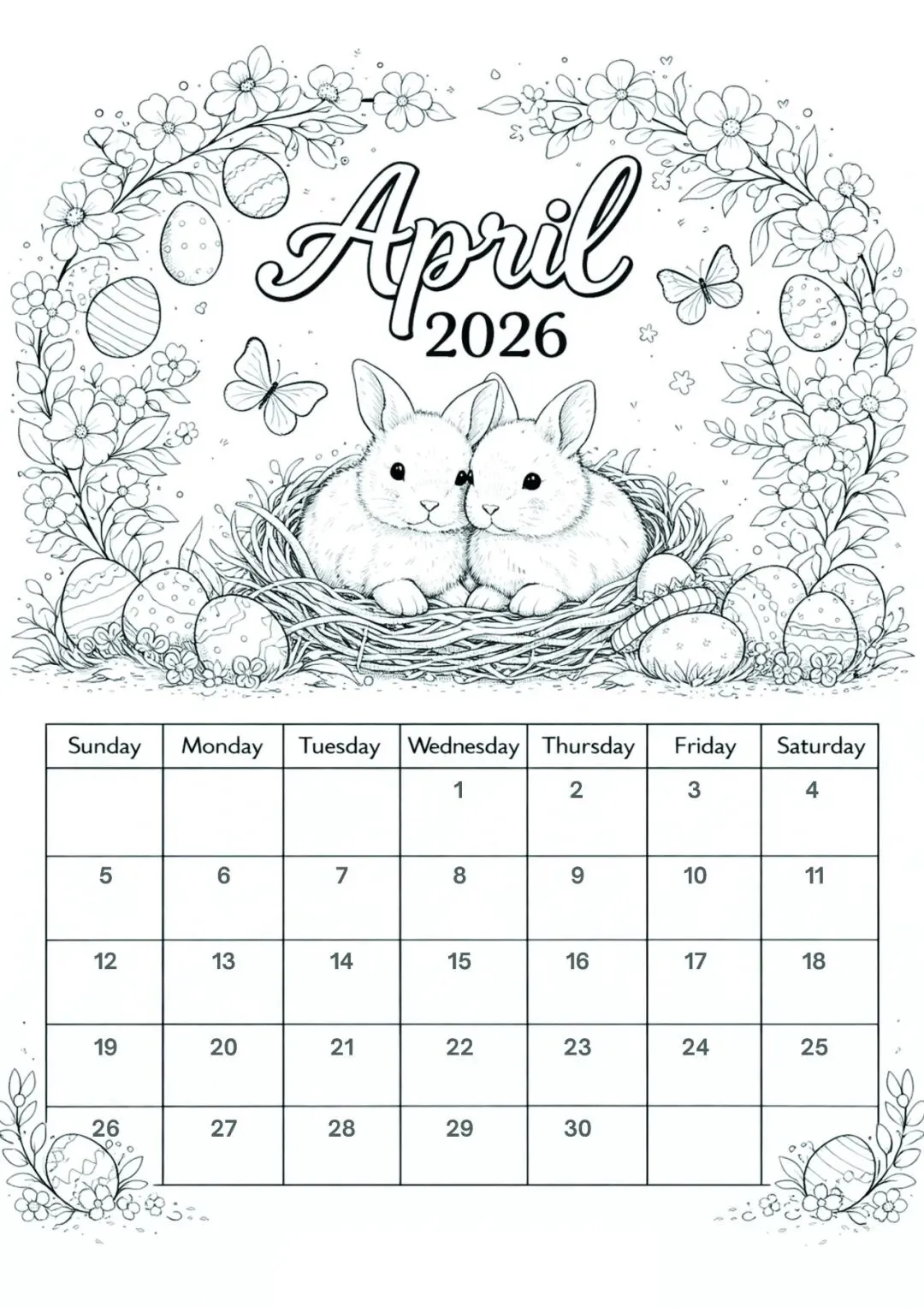 4月日历手绘模板,可打印涂色!