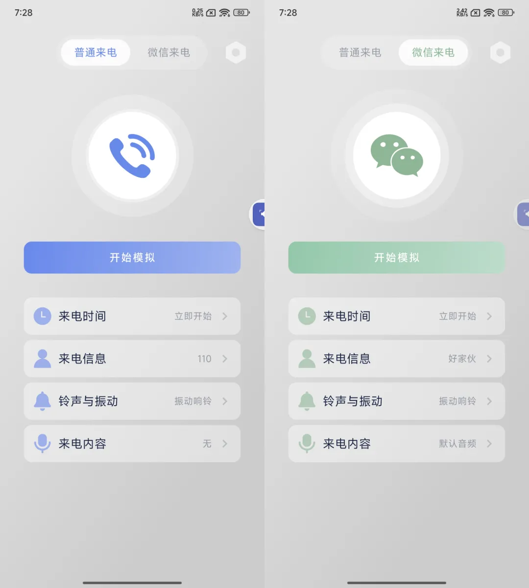 软件可以设置:来电时间、来电信息、来电铃声和振动,甚至还能设置来电对方说话的音频。