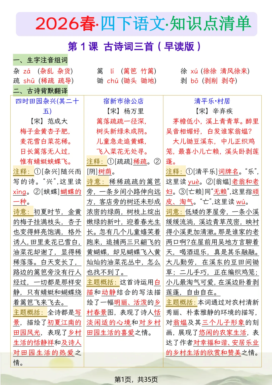 26春四年级语文下册《每课知识清单》,可下载 课文朗读 微课学习 课件教案 生字字帖 每课一练 必背内容 课文划重点 课堂笔记 晨读晚背 温馨提示:保存图片可打印或拉到文末可下载 声明:素材来源网络。需要更多预习资料请点击→语数英多版本1-6年级下册《预习资料包》,一键下载 下载方法▲扫码关注编部本小学语文 在公众号消息框(后台)回复:659资料下载视频讲解(点击观看) 单击下方阅读原文直接获取网盘下载地址(自助下载)