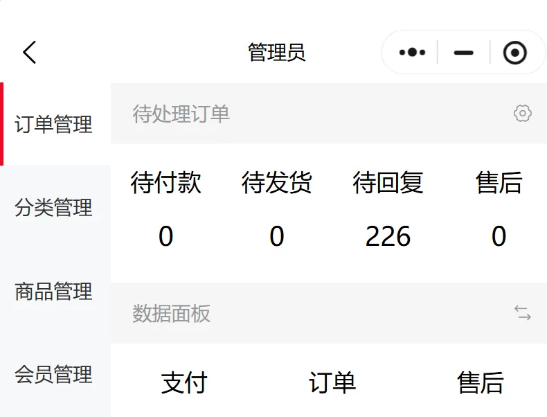 在采云小程序商家端的「待处理订单」模块中,「1.1 订单」用于集中展示尚未完结的业务:待付款、待发货、待回复以及售后相关订单。商家通过页面上的待付款、待发货、待回复入口,可进入订单列表页面,在同一套列表界面中按不同状态查看与处理订单。