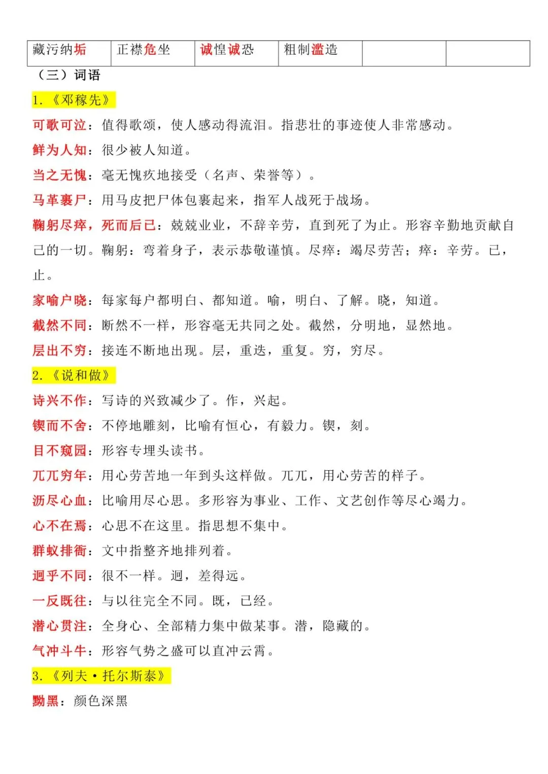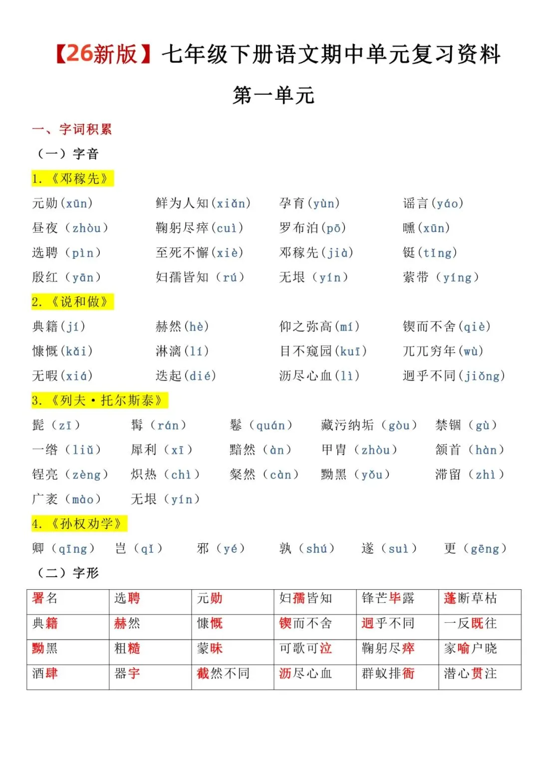 七年级下册语文期中单元复习资料电子版可打印