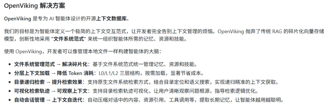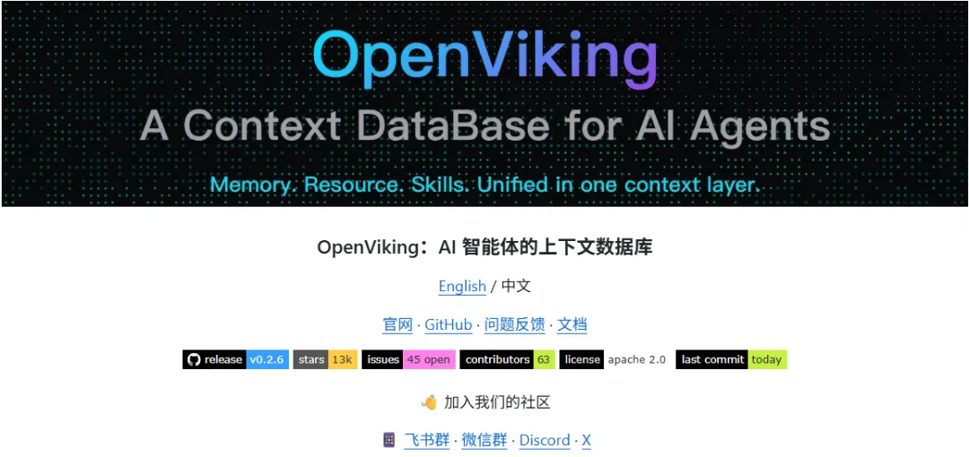 说白了,问题出在 AI 的「上下文管理」上 —— 就像人记不住太多零散信息,AI 处理任务时,那些聊天记录、参考资料、操作指令,要么乱成一团,要么被随便删减,自然做不好事。今天就给大家分享一个 GitHub 上的宝藏工具:OpenViking(官网:https://openviking.ai/),专门解决 AI 上下文管理的痛点,小白也能轻松用,帮你省时间、提效率!01先搞懂:OpenViking 到底是个啥?简单说,OpenViking 就是给 AI 助手装的「智能文件柜 + 记忆管家」。它不像那些复杂的编程工具,核心就干一件事:把 AI 需要的所有信息(比如你的对话、参考文档、任务要求),按「文件系统」的方式整理好 —— 就像你电脑里的文件夹,分类清晰、找起来快,还能让 AI 按需取用,不会丢信息、不会乱解读。不用记专业术语,你只要知道:它能让 AI 从「丢三落四的糊涂蛋」,变成「思路清晰的靠谱助手」。02它能解决啥实际问题?