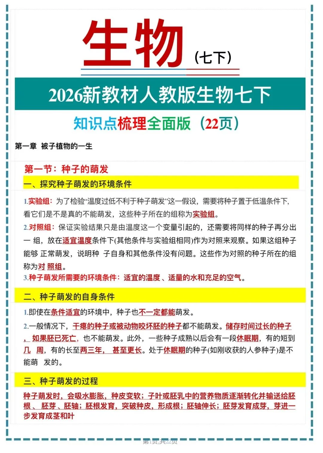 大家好,今天老师整理了:2026版七年级下册生物知识点梳理全面版,可打印电子版!