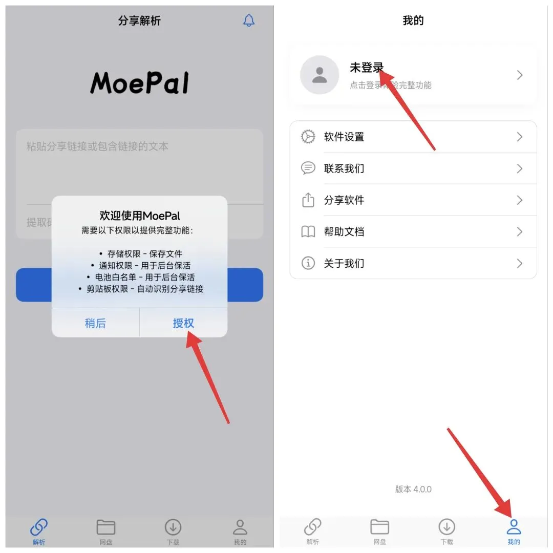 首次使用需要给权限,给储存就可以了,其它看你们自己,进入软件点击”我的”→未登录,注册并登录账号