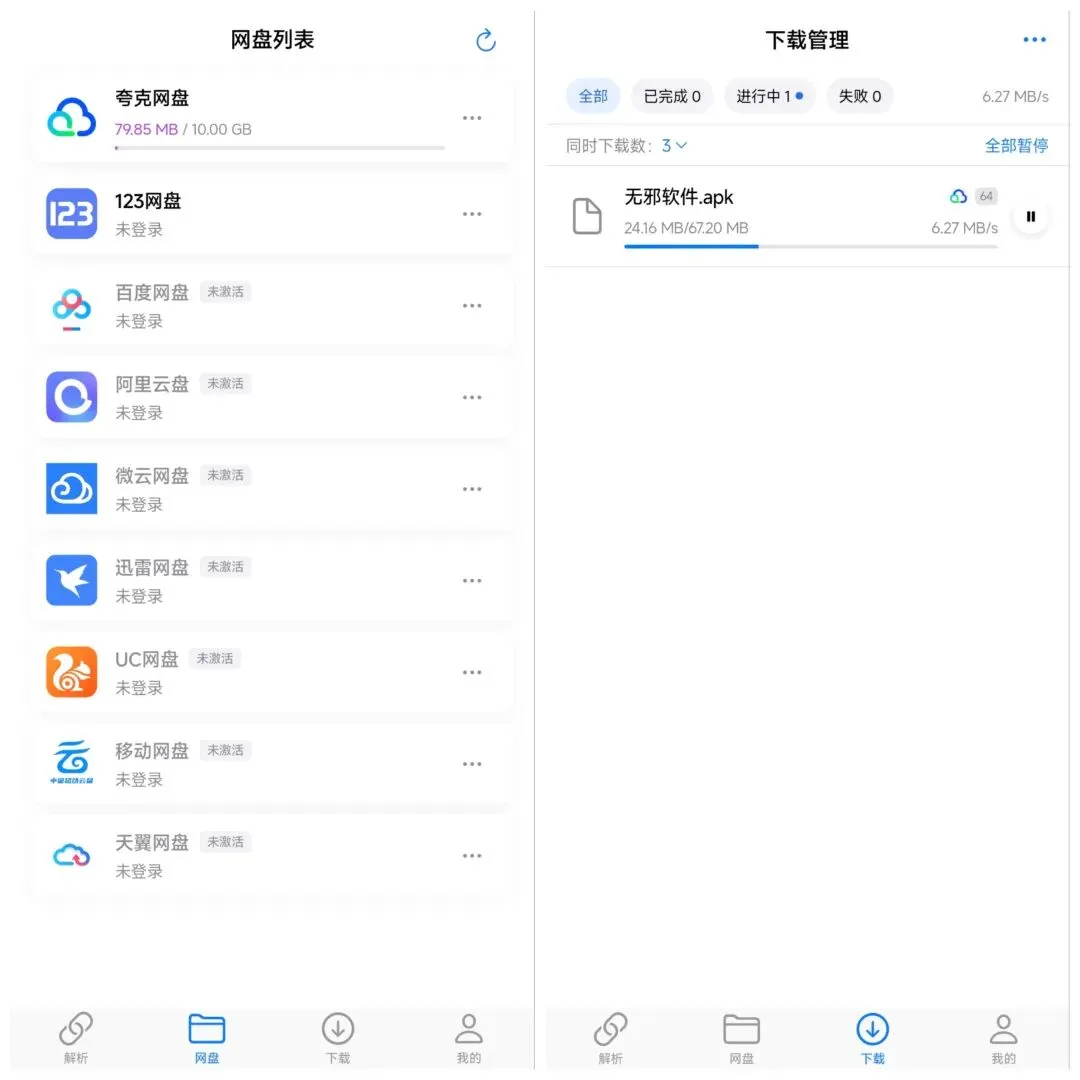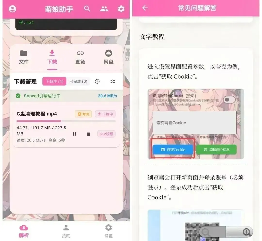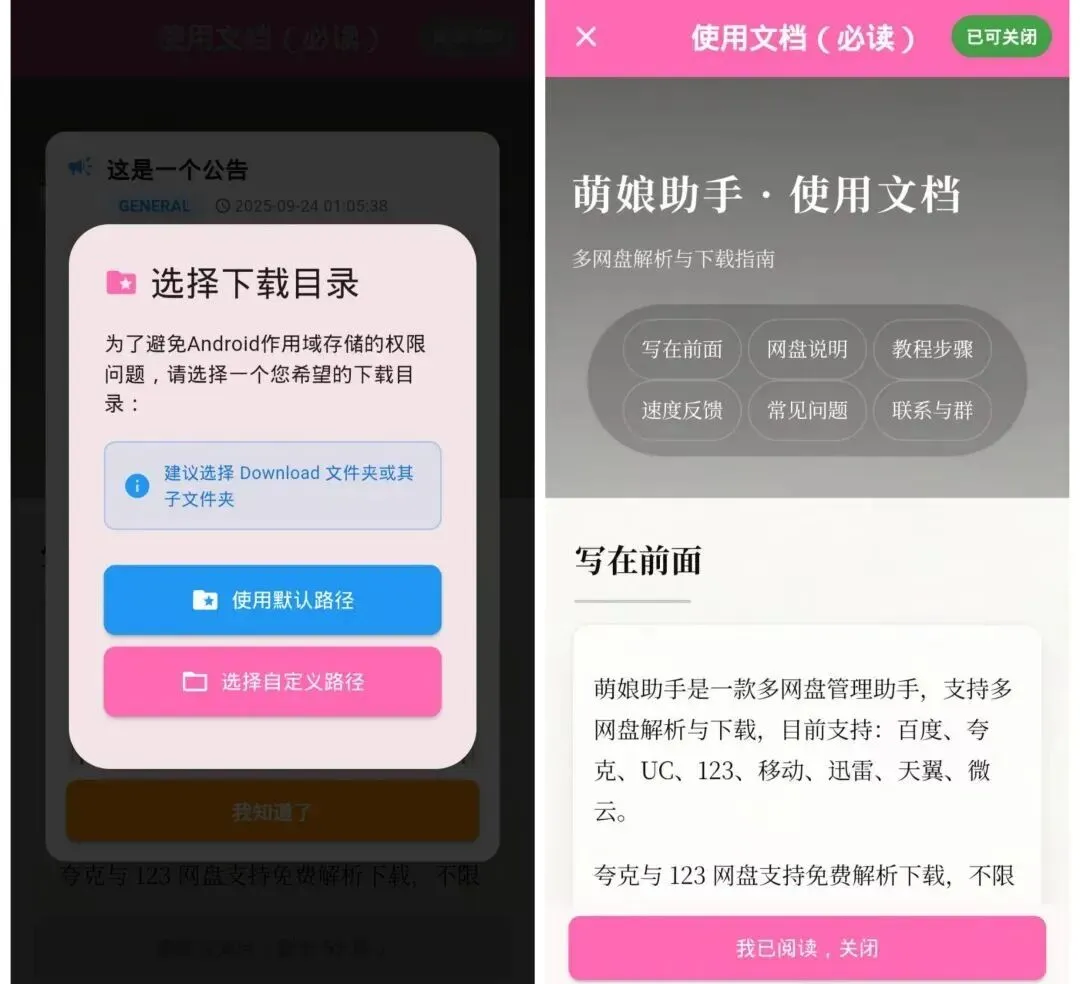 一款轻量级的二次元网盘助手,支持夸克、uc、百度、迅雷等网盘不限速下载,但只有夸克是可以免费使用的!首次打开需要注册并登录账号后才能使用,登录后会让你选择下载路径(选默认就可以),之后有一个使用文档,这个就是使用教程了,有视频和图文的!