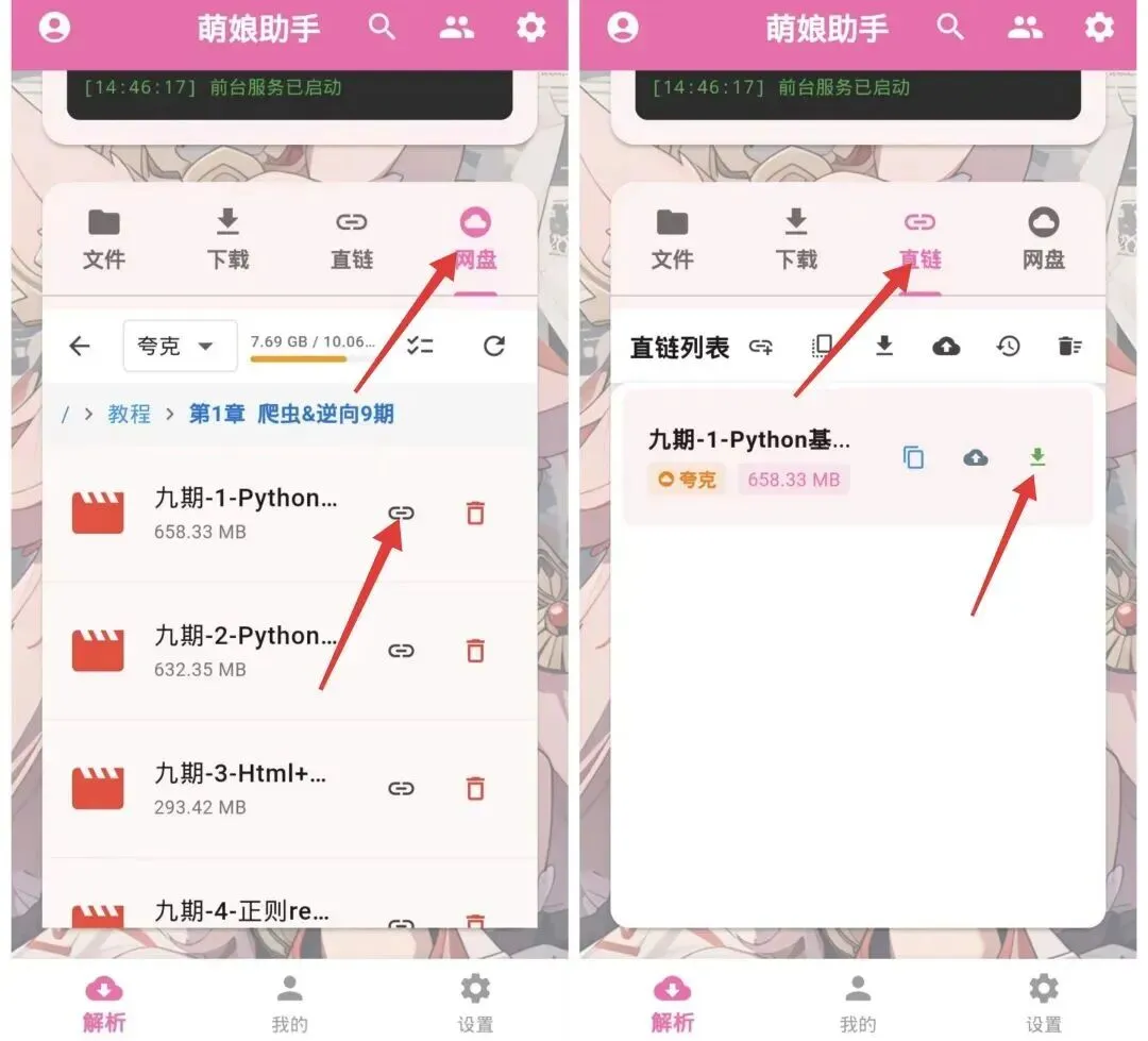 之后回到”解析”页面→点击”网盘”→找到要下载的文件→点击”链接”图标→点击”直链”→然后点击”下载”图标就可以了
