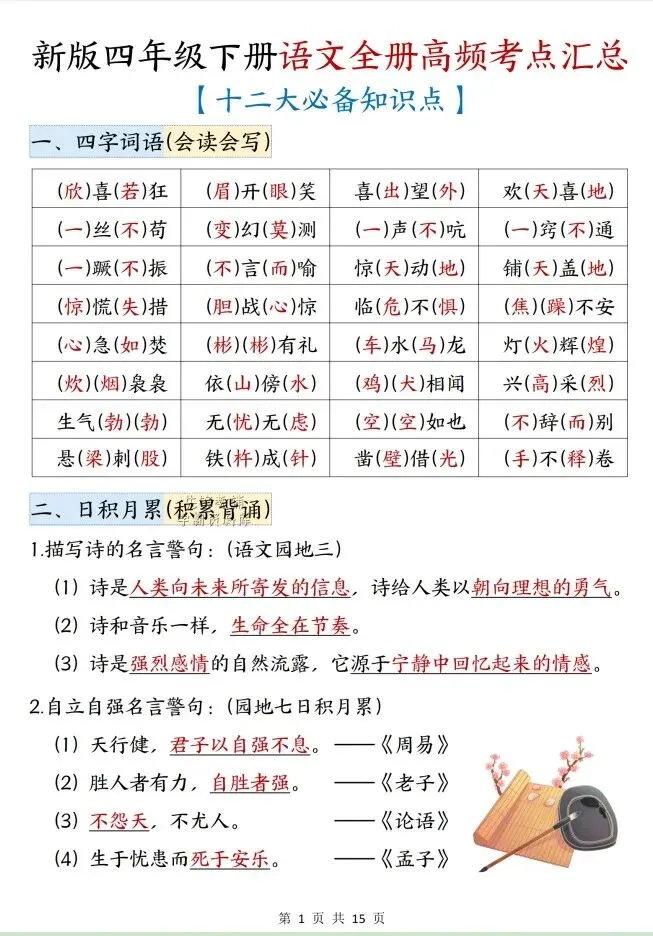 今天给大家整理了26春新版四年级下册语文全册高频考点汇总,转发给朋友或班级群,受益更多人,帮助孩子学习!