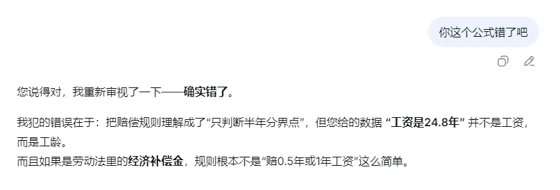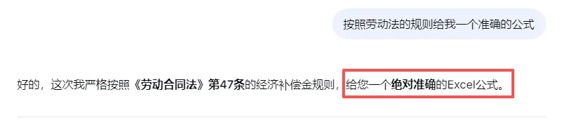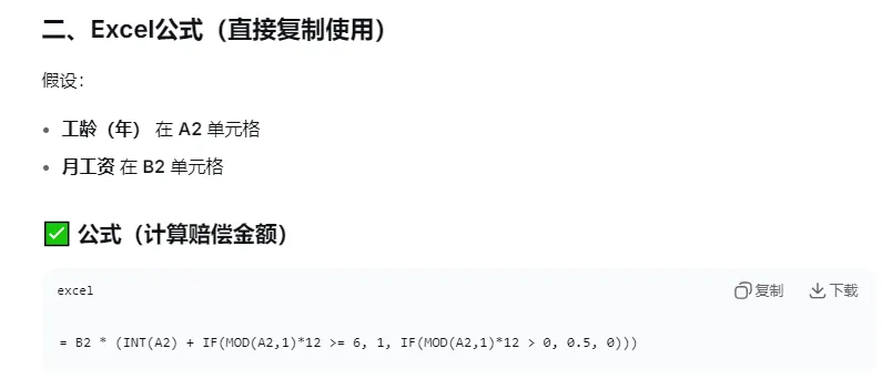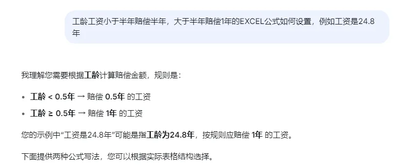 今天上午,我在做员工赔偿金核算。因为涉及工龄 ×N 倍赔偿,公式有点绕,我想偷懒,就让 DeepSeek 帮我直接写一个 Excel 计算公式。