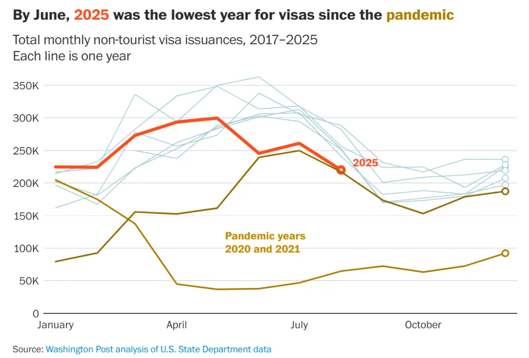 首当其冲的是留学生和交流访问群体:学生签证暴跌30%。与此同时,用于医生、访问学者的J类签证也减少了近3万份。这一变化与2025年中期一系列针对留学生签证的收紧动作同步发生——包括更严格的背景审查,以及对部分签证的撤销行动。简而言之,留学这条路正变得越来越“不稳”。