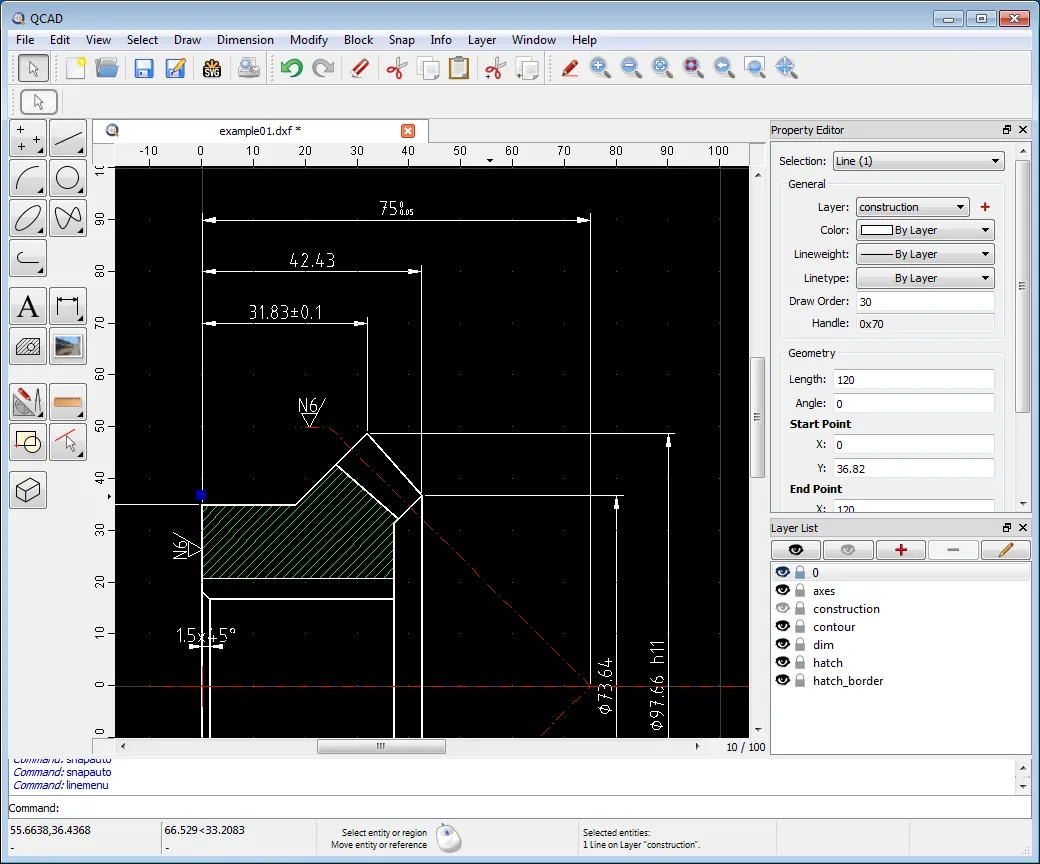 该程序的功能列举如下:图层、块(分组)、35种CAD字体、40多种施工工具、20多种修改工具等等。许多用户都非常喜欢QCAD易于使用的界面和多功能性,给出了很高的评价。