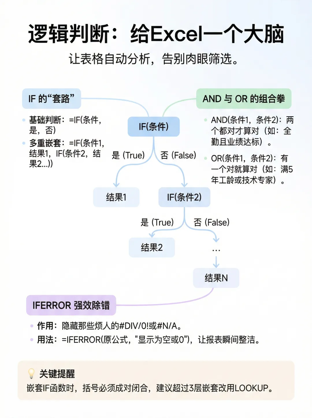 基础判断: =IF(条件, 满足条件返回的结果, 不满足条件返回的结果)多重嵌套:可实现多条件逐级判断,公式写法=IF(条件1, 结果1, IF(条件2, 结果2,...))AND+OR组合拳AND(条件1, 条件2)