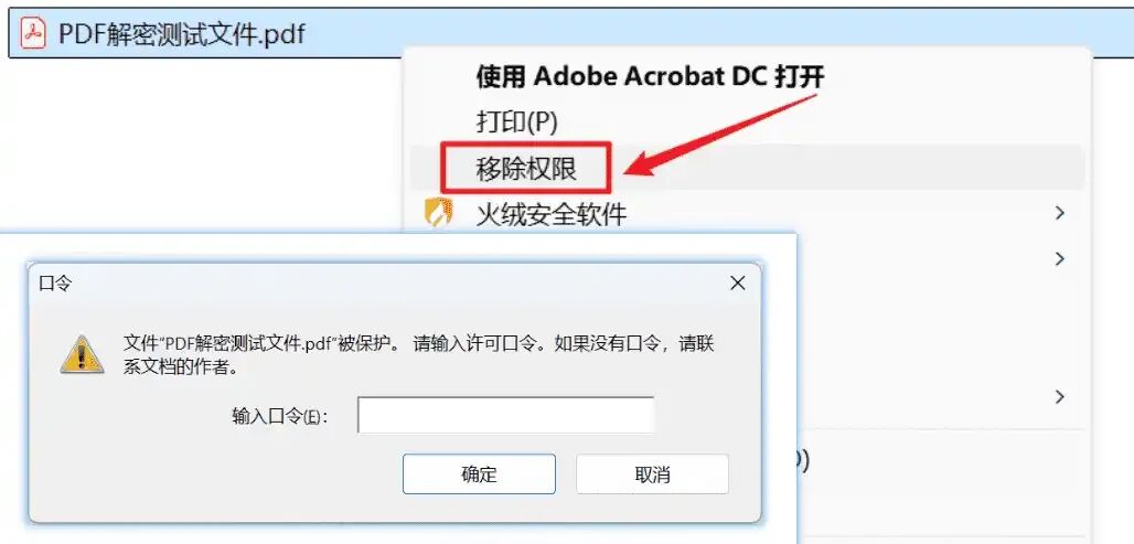 - 选中加密的 PDF 文件 → 右键 → 点击 “移除权限”
