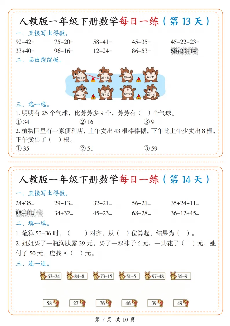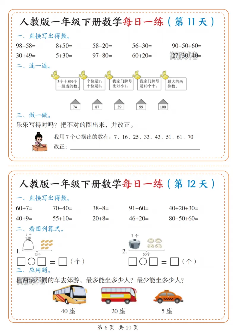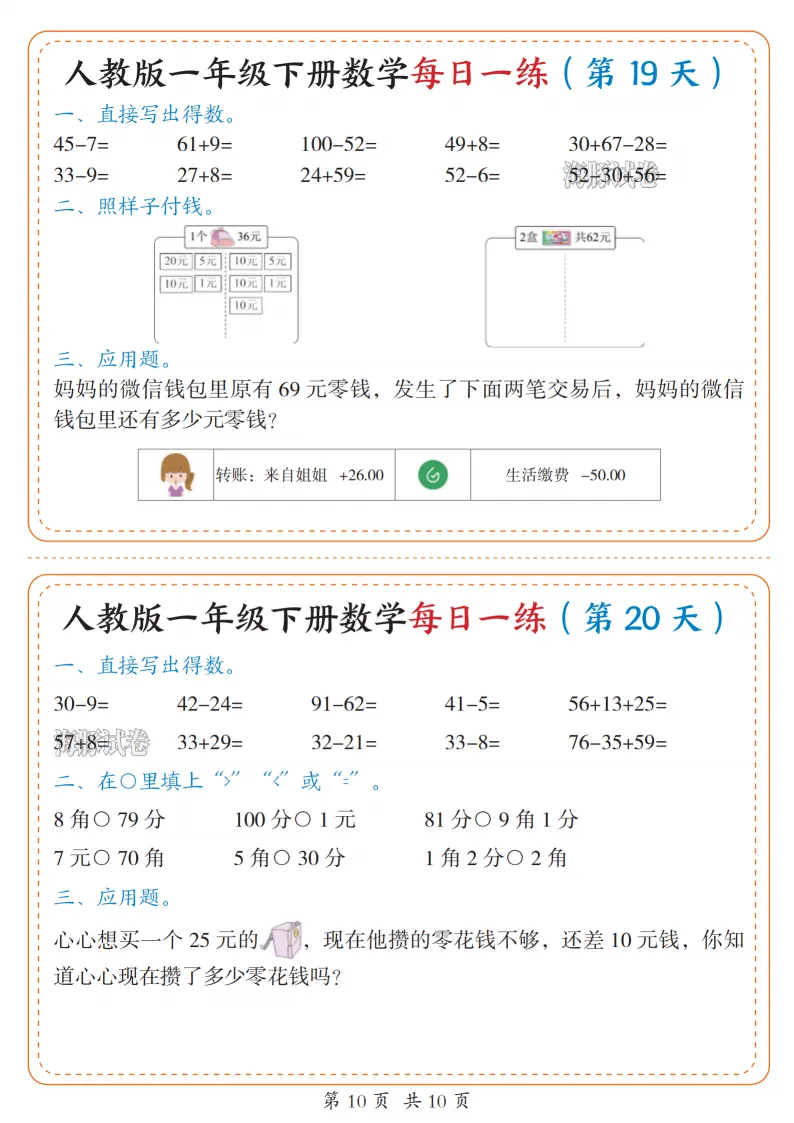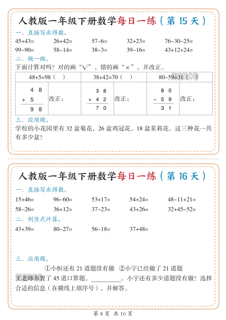 🌸今天给家长分享的是:26一年级下册数学《每日一练》|电子版可打印