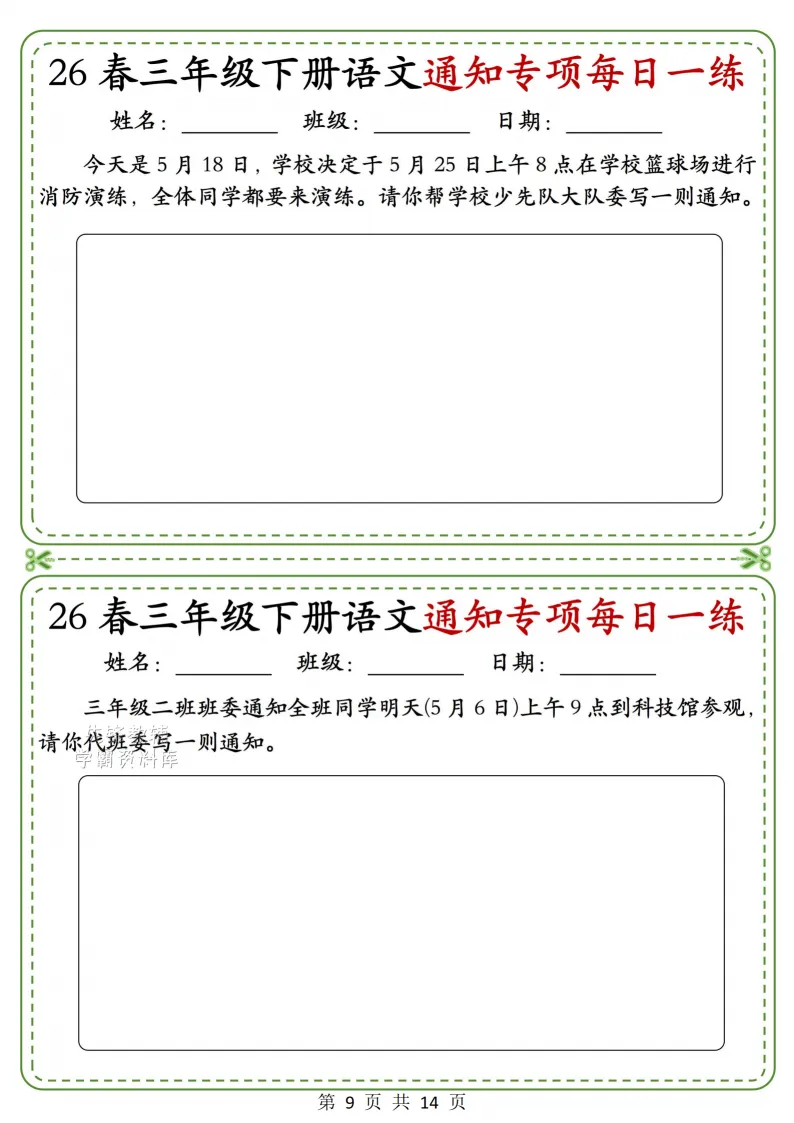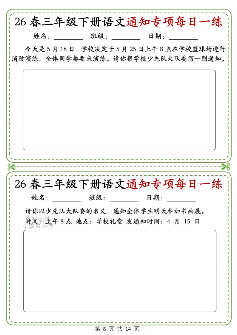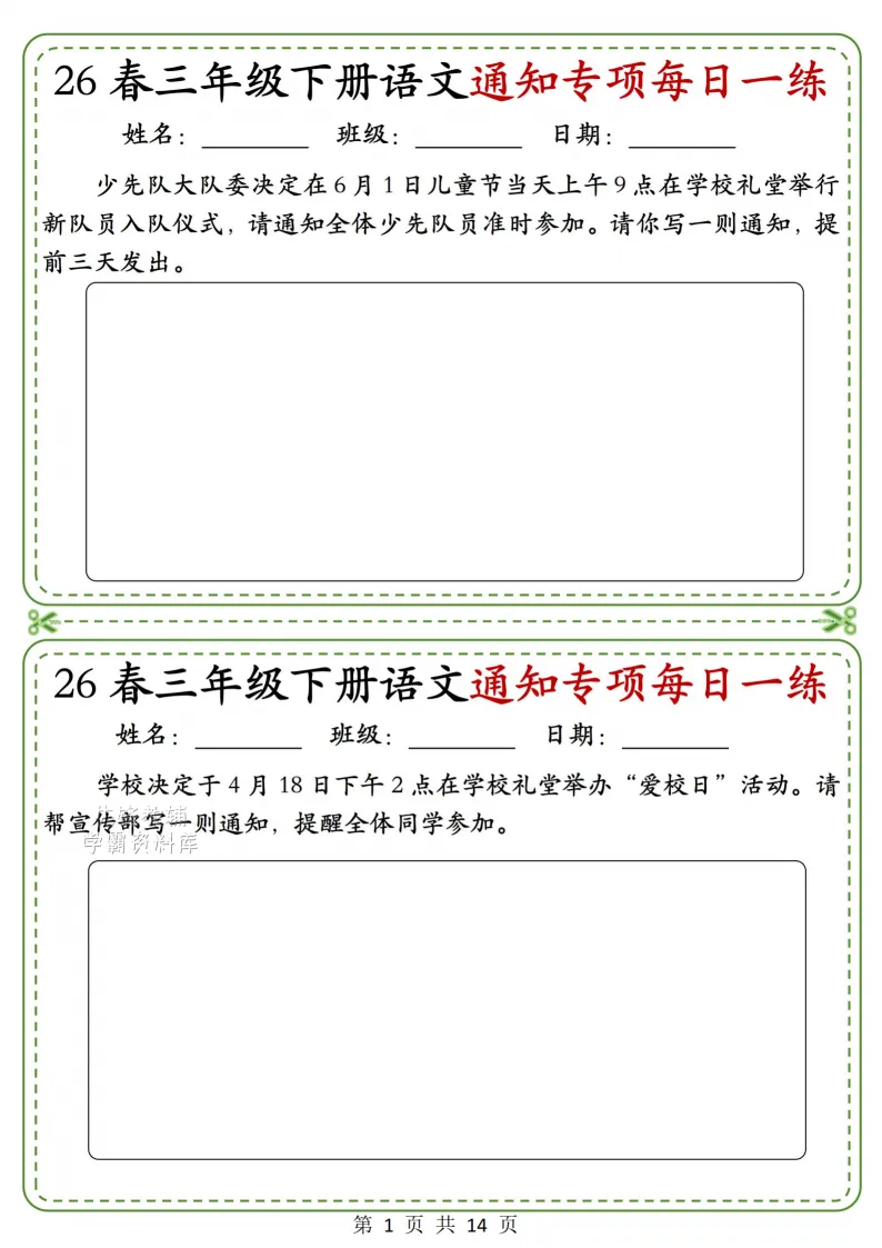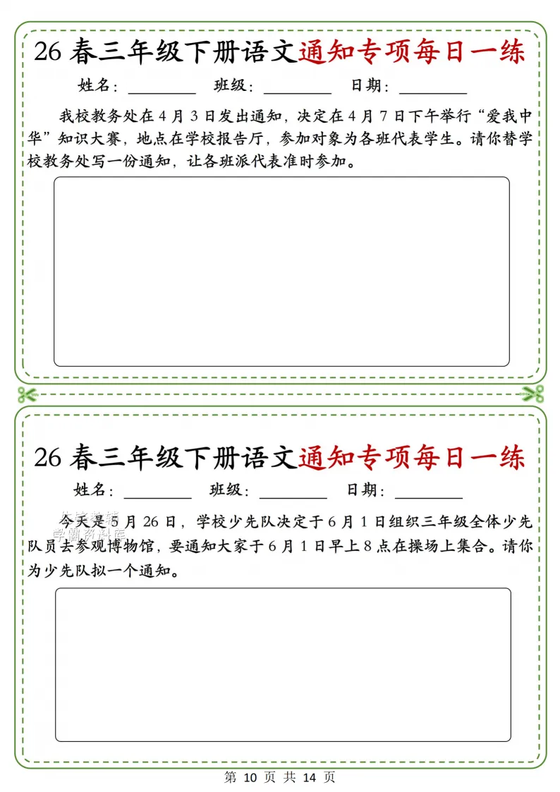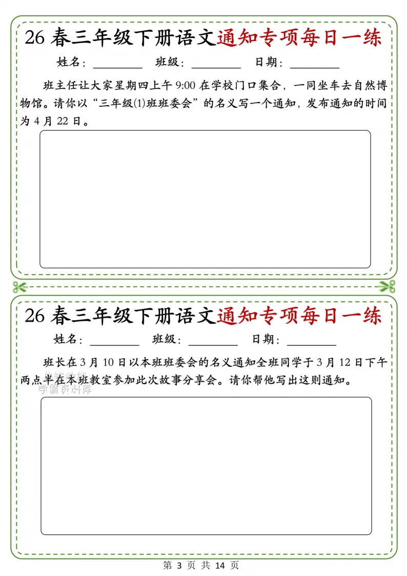 三年级(下)语文通知专项_(含答案),电子版可打印 点击上方关注领取更多学习资源 三年级(下)语文通知专项_(含答案),电子版可下载,同步教材每课内容。需要的家长抓紧打印出来,让孩子用起来。 (温馨提示:文末有完整电子版领取方式) 免费领取电版 关注公众号:“博学小课堂” 文章文末:点赞+再看 发送关键字:260327 说明 教辅在精不在多 ,如果觉得资料好,孩子需要正常使用 ,建议购买正版图书本公众号分享教辅资料,是为了给大家介绍、展示教辅资料的内容和特点,推荐大家购买正版教辅。 为了更好地展示资料的情况,我们可能会用到一些资料的截图、官方的样书,或者网络上公开的电子资料,如果权利人认为这些展示可能会侵害到您的权利,请直接告知我们,我们会立刻删除。