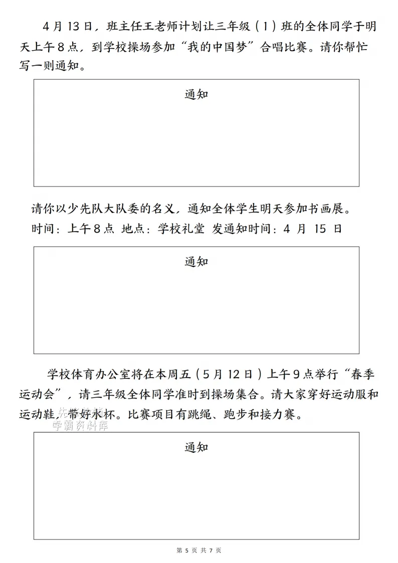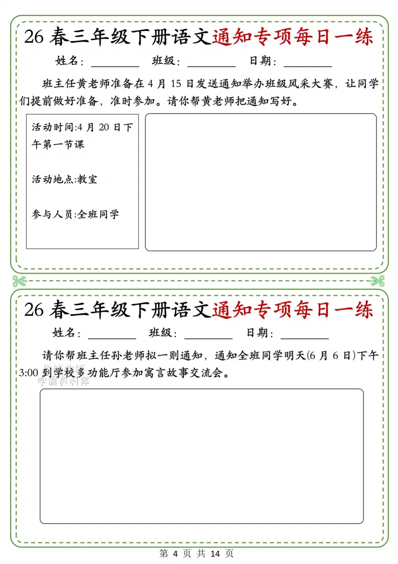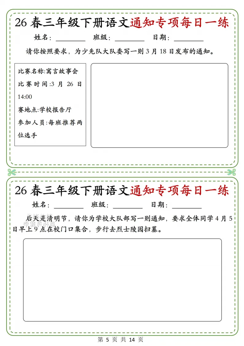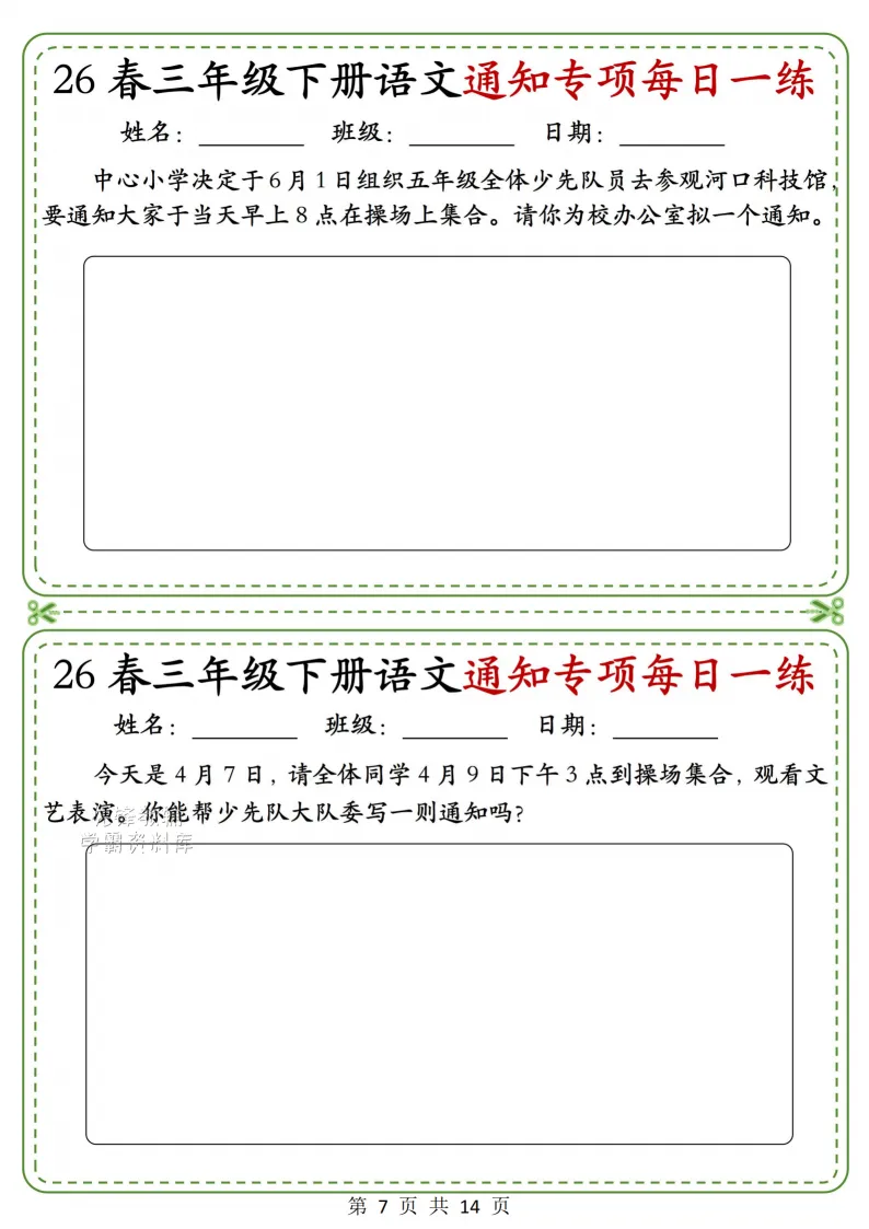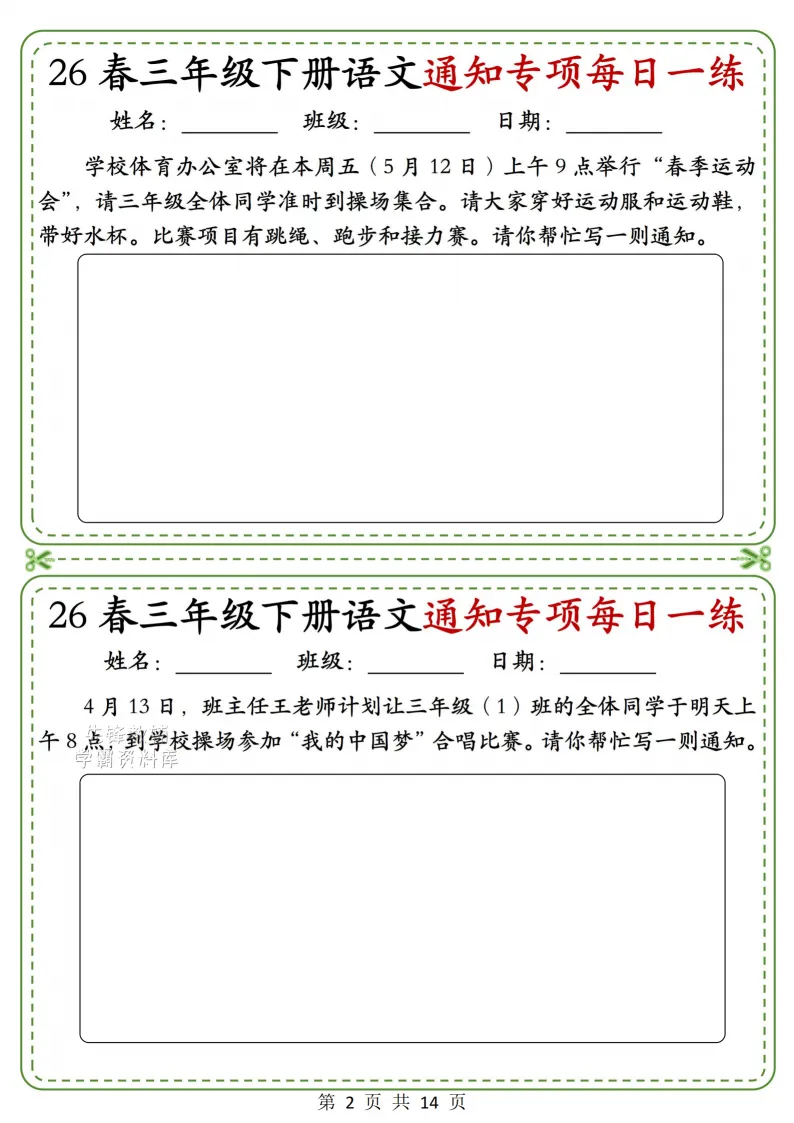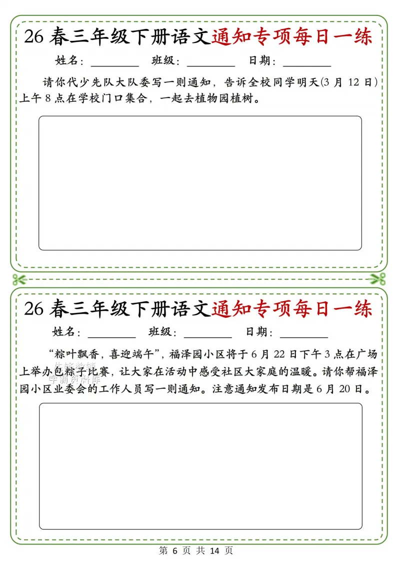 三年级(下)语文通知专项_(含答案),电子版可打印 点击上方关注领取更多学习资源 三年级(下)语文通知专项_(含答案),电子版可下载,同步教材每课内容。需要的家长抓紧打印出来,让孩子用起来。 (温馨提示:文末有完整电子版领取方式) 免费领取电版 关注公众号:“博学小课堂” 文章文末:点赞+再看 发送关键字:260327 说明 教辅在精不在多 ,如果觉得资料好,孩子需要正常使用 ,建议购买正版图书本公众号分享教辅资料,是为了给大家介绍、展示教辅资料的内容和特点,推荐大家购买正版教辅。 为了更好地展示资料的情况,我们可能会用到一些资料的截图、官方的样书,或者网络上公开的电子资料,如果权利人认为这些展示可能会侵害到您的权利,请直接告知我们,我们会立刻删除。