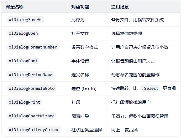 下次当你需要用户输入点什么、选择点什么的时候,先别急着画 UserForm,查查 Dialogs 列表。说不定,那个完美的窗口,Excel 早就为你准备好了。