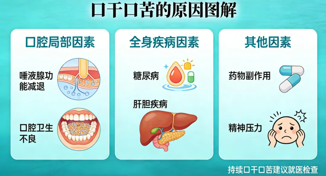 肝脏负责分泌胆汁,如果肝功能受损,胆汁代谢紊乱就会导致口苦。同时,肝脏解毒能力下降,体内毒素积累,也会引起口干。