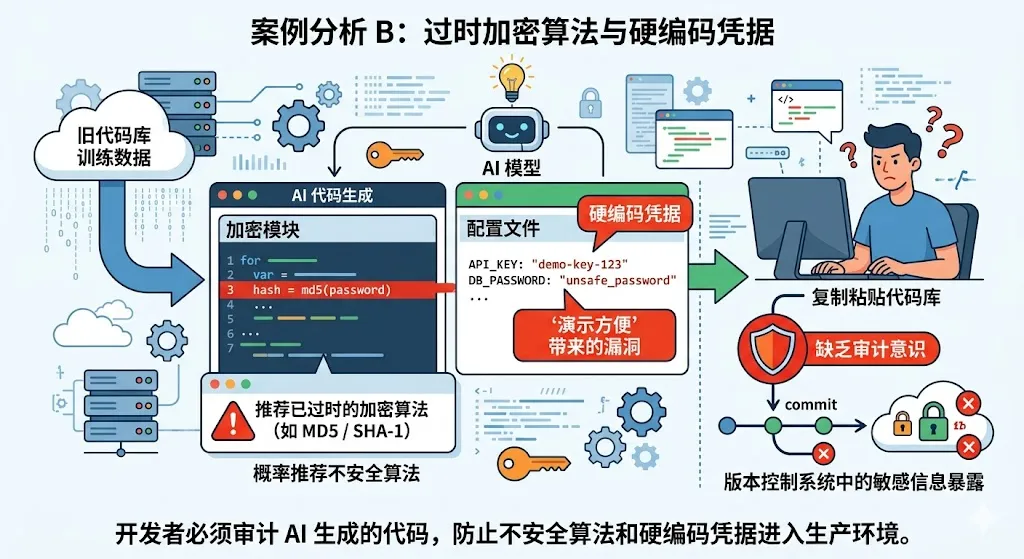 案例分析 B:过时加密算法与硬编码凭据AI 的训练数据包含大量旧代码库。实验研究发现,在生成加密相关的模块时,AI 有一定概率推荐已被宣布为不安全的加密算法(如 MD5 或 SHA-1)。此外,AI 有时会为了“演示方便”而在生成的配置文件中提供硬编码的 API 密钥或数据库密码。如果开发者在复制粘贴时缺乏审计意识,这些敏感信息将随代码库一同暴露在版本控制系统中。