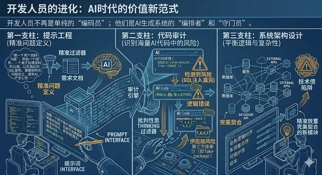 在 AI 时代,开发者的价值不再体现在“写出代码”,而在于: