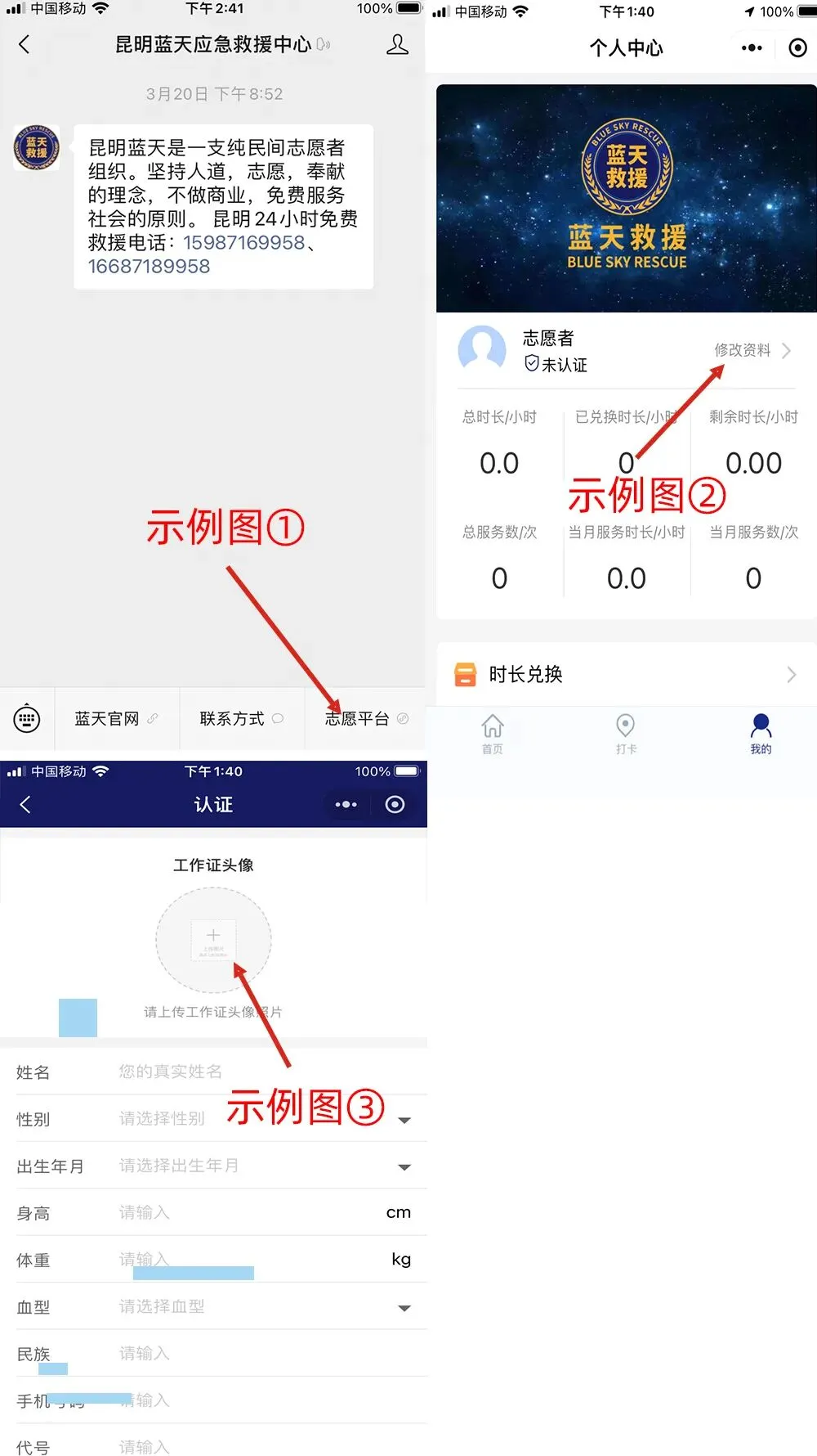 2、上传方式:公众号底部菜单-志愿平台(图①)-我的-修改资料(图②)-点击工作证头像处(图③)即可上传。