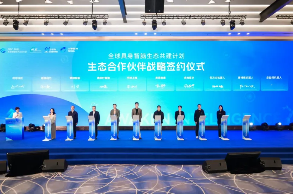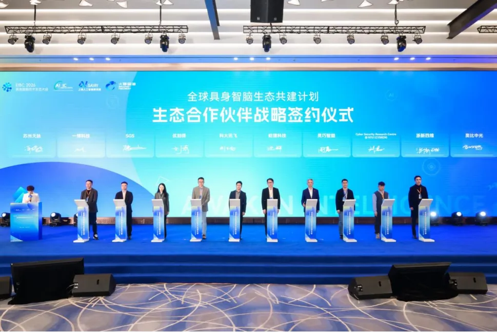 工信部电子信息司二级巡视员吴国纲、上海科技创业投资(集团)有限公司党委书记、董事长朱民、上海人工智能研究院副院长许春山等嘉宾共同启动“全球具身智脑生态共建计划”,并完成首批生态合作伙伴战略签约。