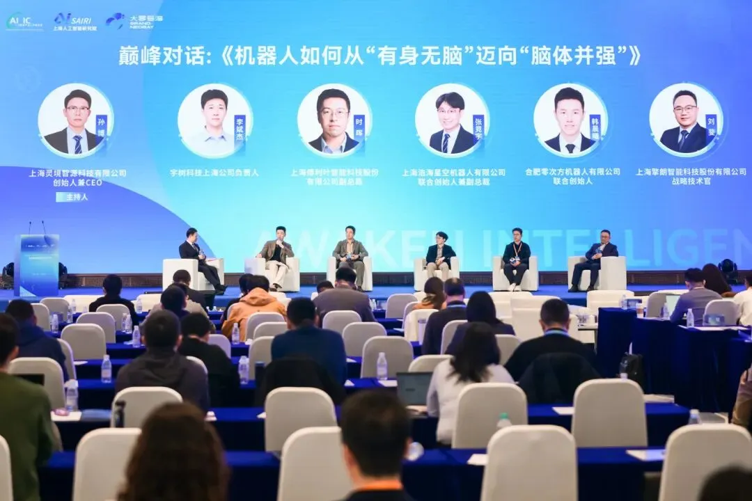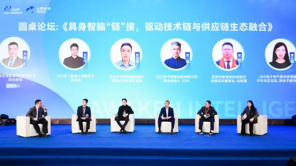 随后的三场对话环节层层递进,全面把脉具身智脑发展路径。上海人工智能研究院首席科学家闫维新与开源鸿蒙具身智能项目管理委员会主席、上海交通大学特聘教授古金宇围绕《从感知到进化:具身智脑的学术突破与未来图景》展开前沿对谈,描绘了从感知智能向认知智能演进的技术跃迁路径。巅峰对话以“机器人如何从‘有身无脑’迈向‘脑体并强’”为主题,由灵境智源创始人兼CEO孙博主持,宇树、傅利叶、零次方、擎朗、浩海星空等企业代表结合实践,探讨了本体与智脑协同演进的产业化路径。圆桌对话围绕“具身智脑‘链’接,驱动技术链与供应链生态融合”展开,聚焦标准共建、场景牵引与生态共赢,科大讯飞、SGS、天脉、灵巧智能、奥比中光等企业代表参与交流。