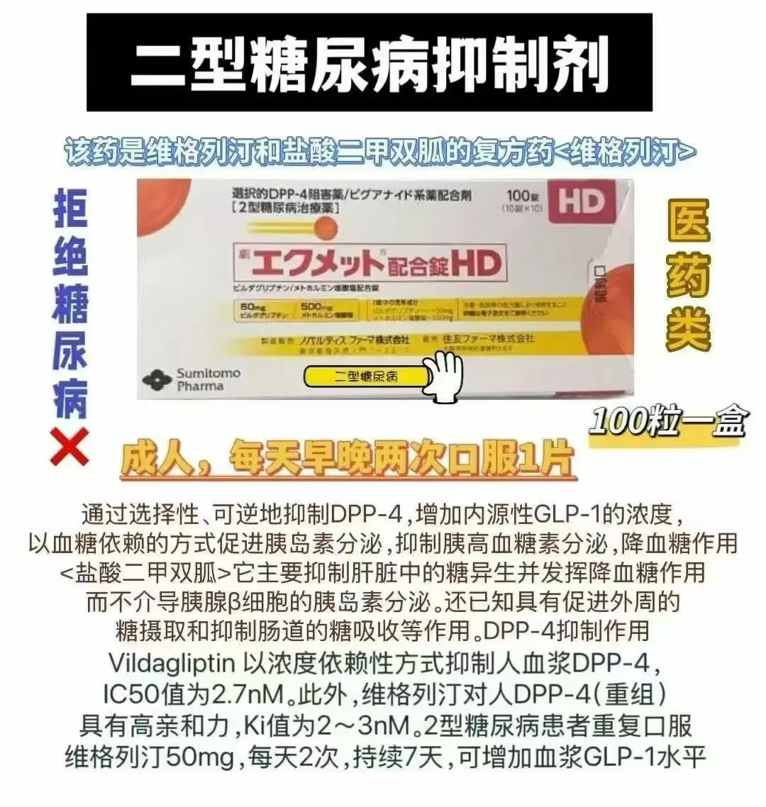 【使用说明】新型口服降糖药DPP-4抑制剂&双胍组合药物:二甲双胍维格列汀复合片エクメット配合錠HD
