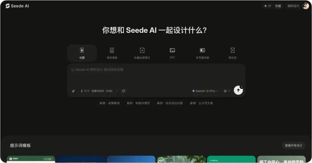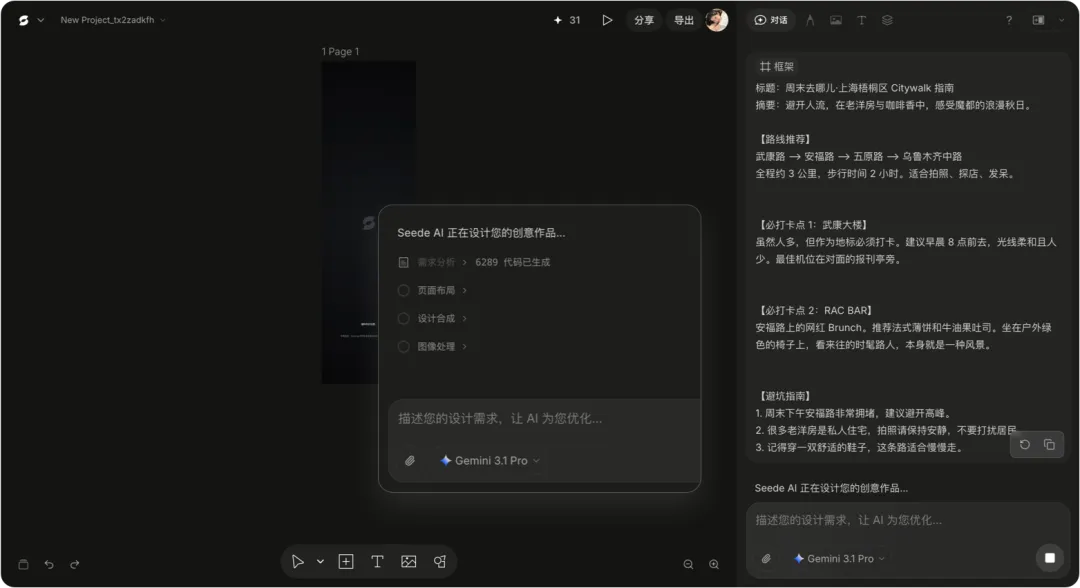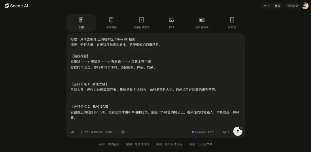 打开 Seede AI,选「长图」场景,把我的路线文案、打卡点、避坑指南一股脑粘进去,甚至不用排版,直接提交。