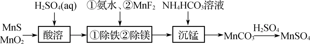 4. (2024·无锡锡东高中)室温下,由二氧化锰与硫化锰矿(含Fe、Mg等杂质)制备MnSO4的流程如图所示。已知:Kb\rc\)(\a\vs4\al\co1(NH3·H2O)=1.80×10-5,Kal\rc\)(\a\vs4\al\co1(H2CO3)=4.30×10-7,Ka2\rc\)(\a\vs4\al\co1(H2CO3)=5.60×10-11,Ksp\rc\)(\a\vs4\al\co1(MnCO3)=2.24×10-11。下列说法不正确的是(D)