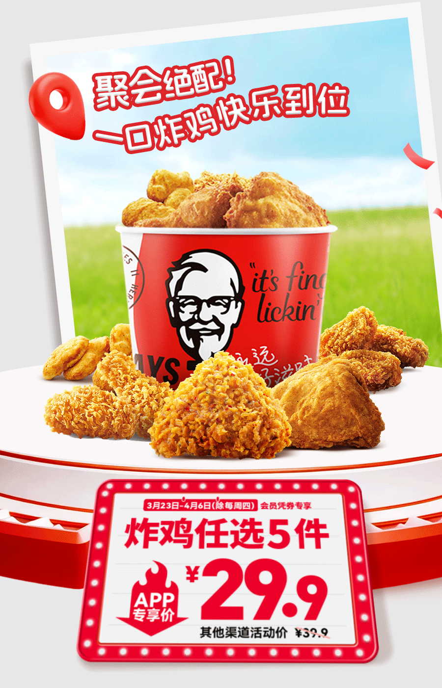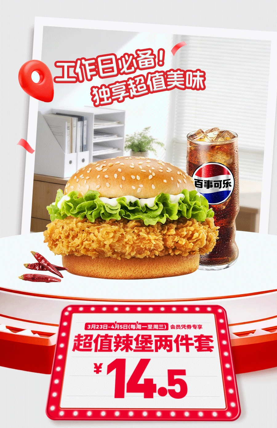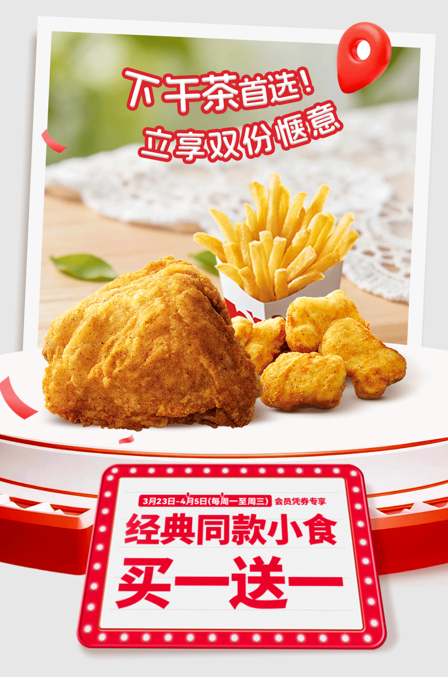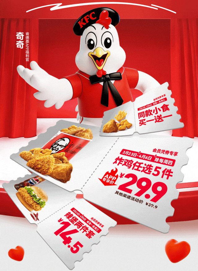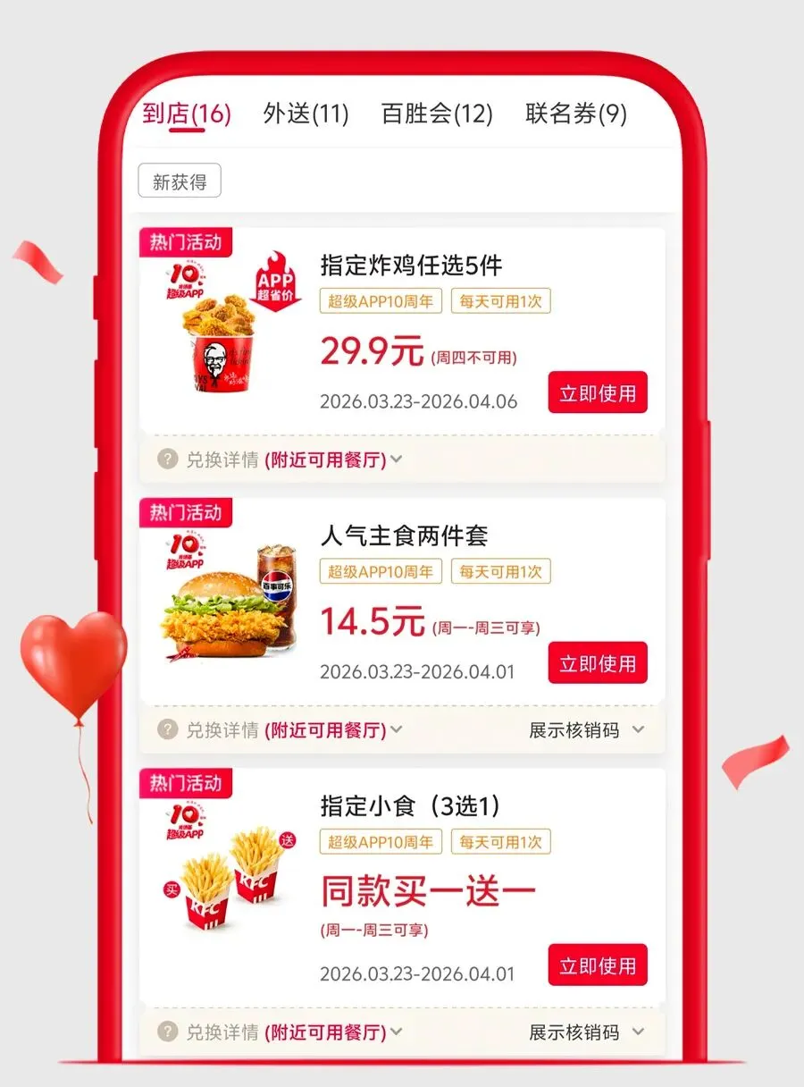 肯德基APP十周年双周一二三特惠活动自2026年03月23日至2026年03月25日以及2026年03月30日至2026年04月01日,活动期间,肯德基WOW会员可获领指定电子优惠券4张,请前往肯德基APP会员卡包查看并使用。肯德基APP十周年一二三五六日APP专享特惠活动自2026年03月23日至2026年04月06日(周四不参与),活动期间,肯德基WOW会员可获领指定电子优惠券2张,请前往肯德基APP会员卡包查看并使用。肯德基APP十周年一二三五六日特惠活动自2026年03月23日至2026年04月06日(周四不参与),活动期间,肯德基WOW会员可获领指定电子优惠券2张,请前往肯德基+小程序卡包查看并使用。活动地区:指定肯德基餐厅。电子券具体使用规则详见“我的卡包”券说明。同一会员就本活动电子券每张仅限领取1次。每单仅限使用一张优惠券。同一ID、同一设备、同一手机号、同一支付账户、同一取餐联系电话、同一送餐联系电话、同一送餐地址,均视为同一用户。对于任何通过不正当手段(包括但不限于作弊、通过机器行为等方式恶意刷单)参加活动获取权益或者不符合活动规则的行为,我们将在不事先通知的前提下取消该用户参与活动的资格和已获得的相应权益。堂食供应时间具体以餐厅实际营业时间为准,仅限有此产品供应的部分肯德基餐厅,交通枢纽、旅游景区的餐厅、精选餐厅以及西藏自治区的餐厅等部分餐厅除外,具体情况以餐厅餐牌公示为准。外送部分送餐区域不供应本产品,详情以输入地址后显示的菜单及送餐时间为准,外送费及打包服务费需自理。除推广产品外,其他物品仅做装饰目的,图示内容仅供参考。产品、周边、玩具及包装以实物为准。不与其他优惠共享。堂食、肯德基宅急送自有渠道、第三方外卖平台外送渠道、甜品站、团购渠道、企业送渠道以及其他渠道的产品组合、价格以及优惠活动,以各渠道页面展示为准。