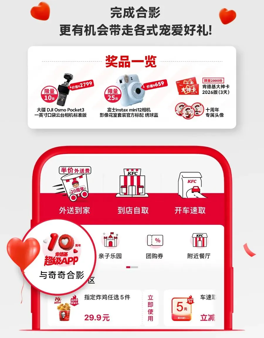 活动时间:2026年3月23日起至2026年3月29日,具体以肯德基APP十周年奇奇合影互动活动时间为准。