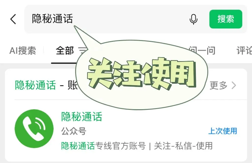 1.打开微信,在顶部搜索栏的公众号搜索框中,查找并关注 【隐秘通话】 官方公众号。
