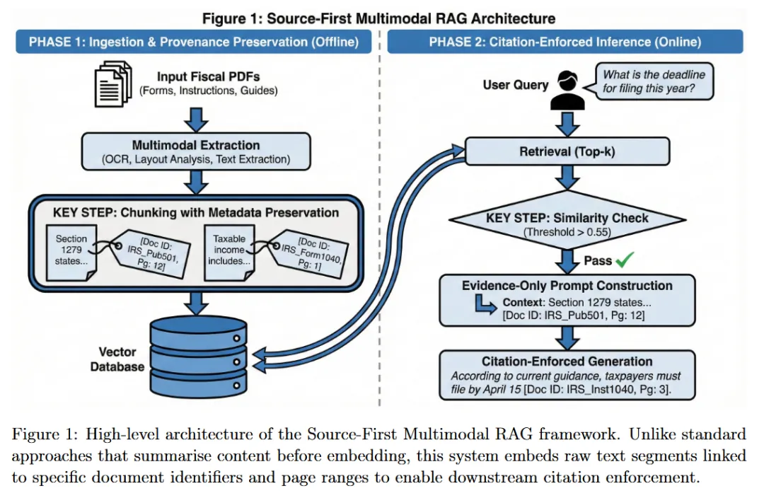 这篇论文提出了一种引用强制、具备弃权机制的多模态RAG框架,专为财政文档智能设计,解决了现有RAG系统在透明度、可审计性、幻觉控制方面的核心痛点。