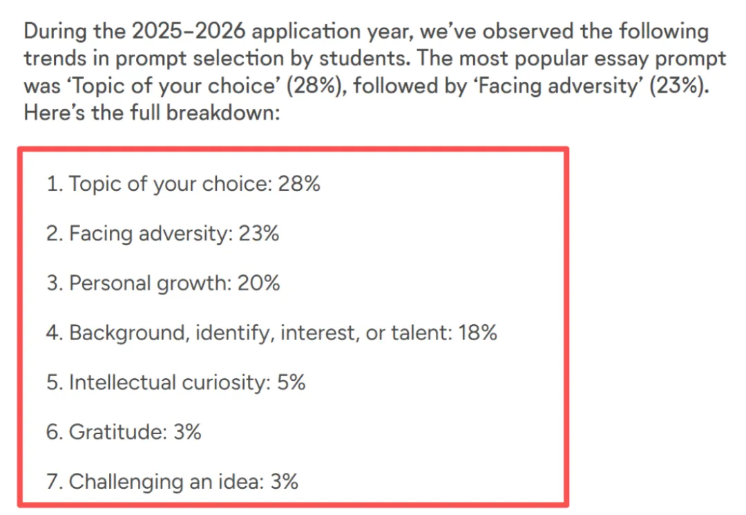 结合Common App官方发布的【2025-2026申请季选题数据】,我们能清晰看到申请者的选题偏好,也能提前避开同质化严重的热门陷阱,理性选择最适合自己的题目。