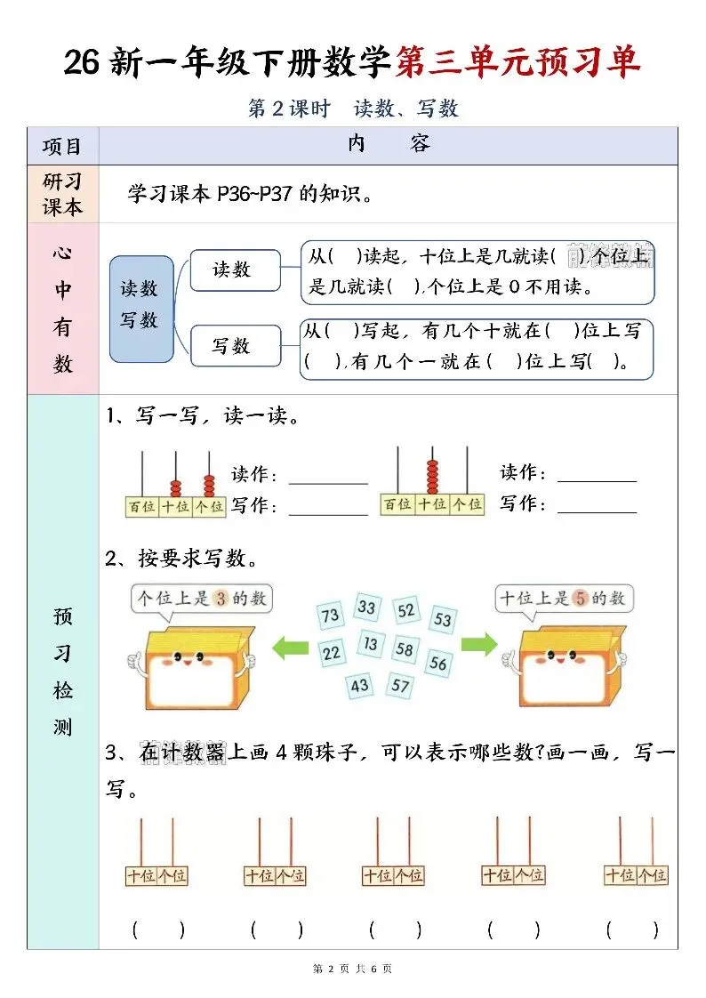 26新一年级下册数学第三单元预习单(电子版可打印)