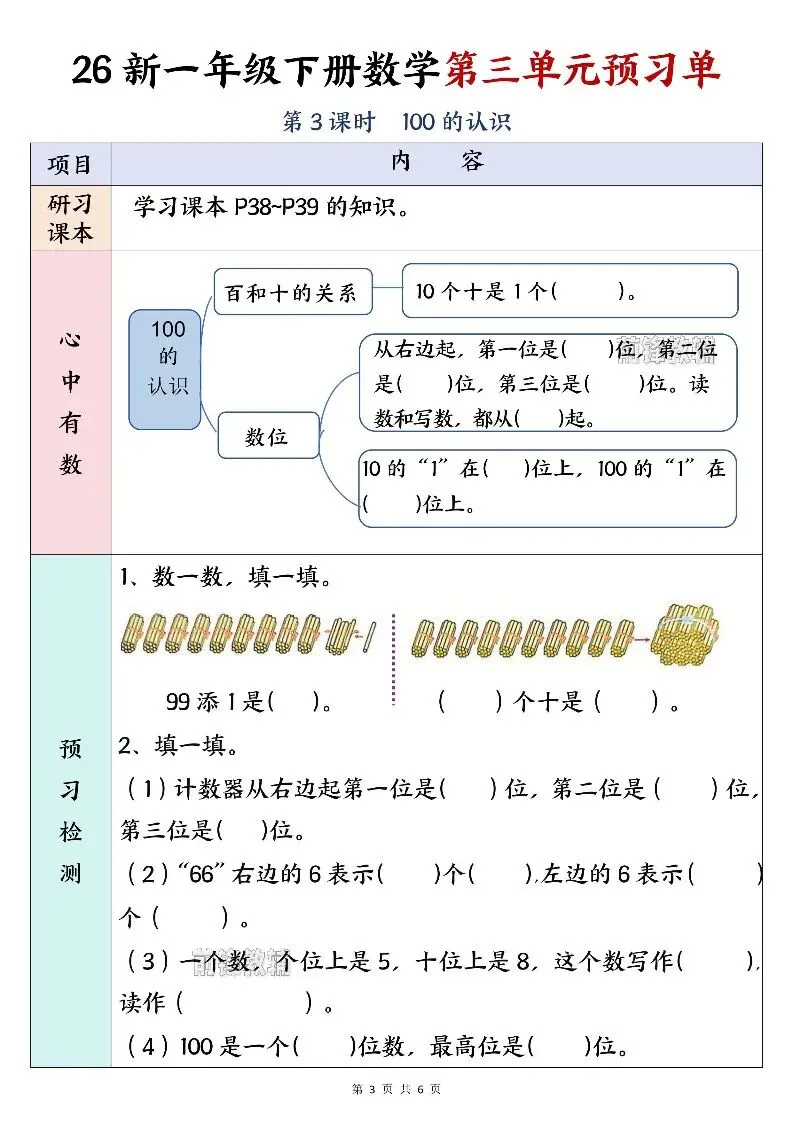 今日为大家更新了最近超火的学习资料,26新一年级下册数学第三单元预习单(电子版可打印),建议分享到班级群/年级群,让其他家长打印出来,帮助孩子学习!