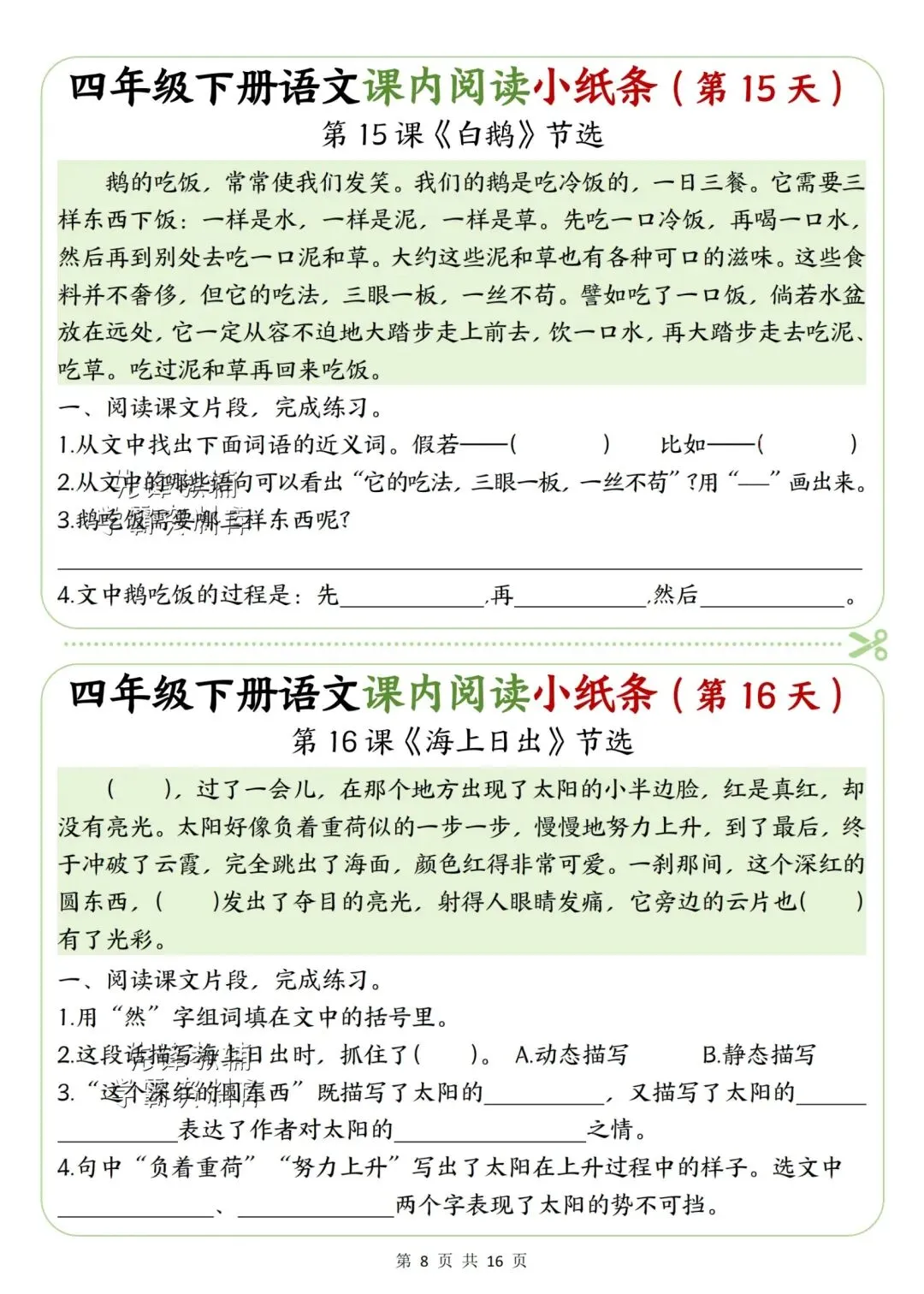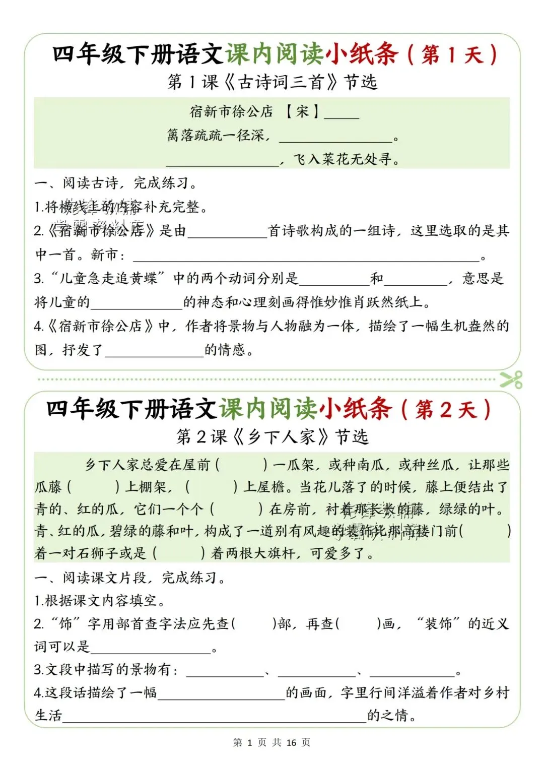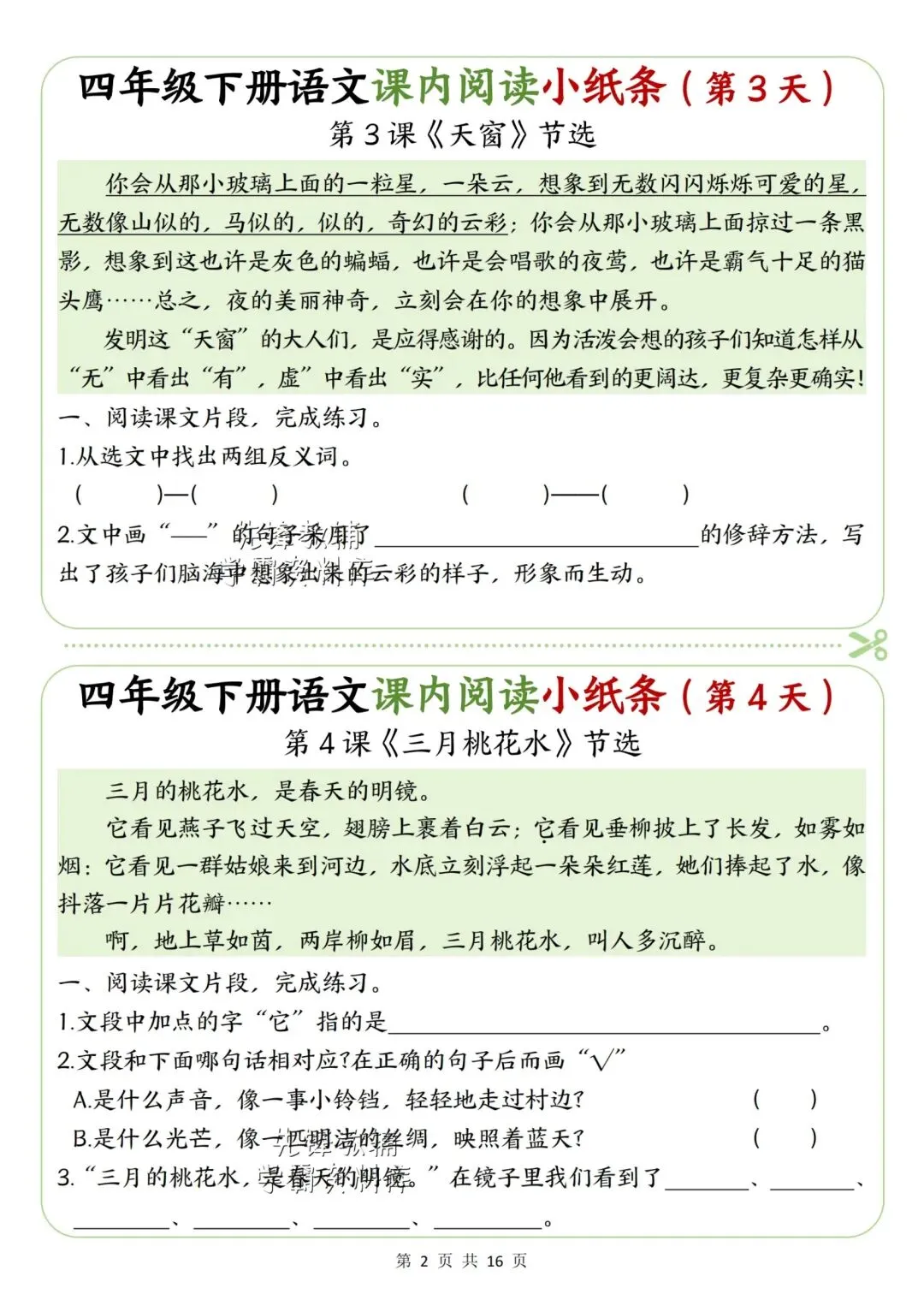 新版四年级下册语文课内阅读小纸条高清电子版可打印