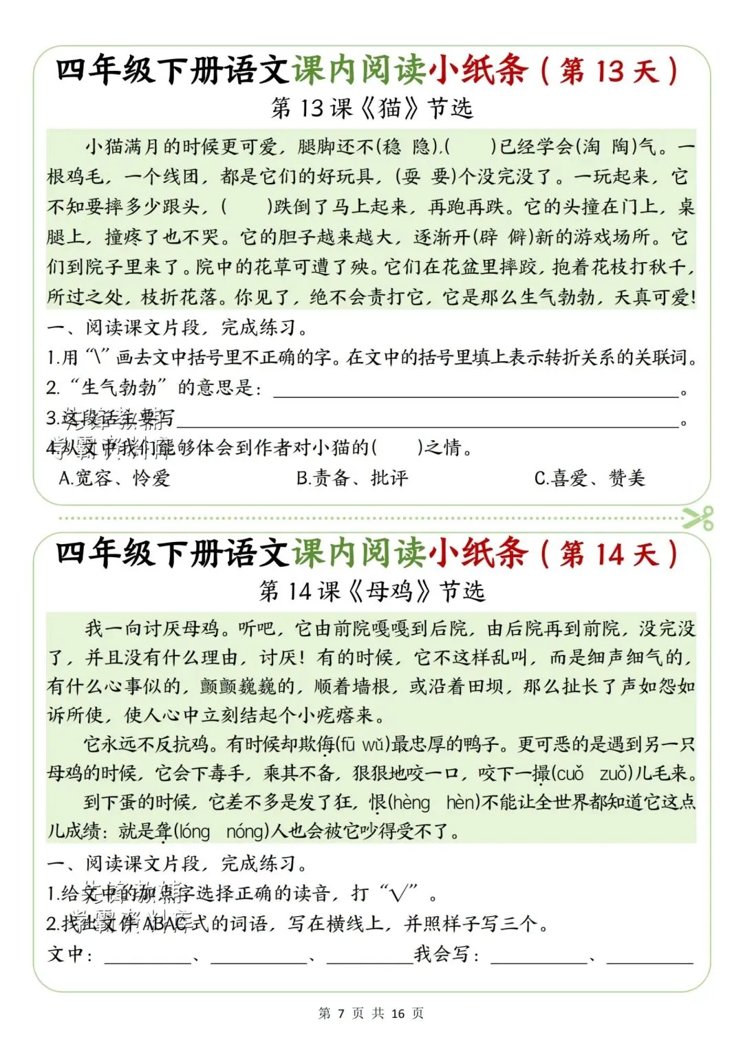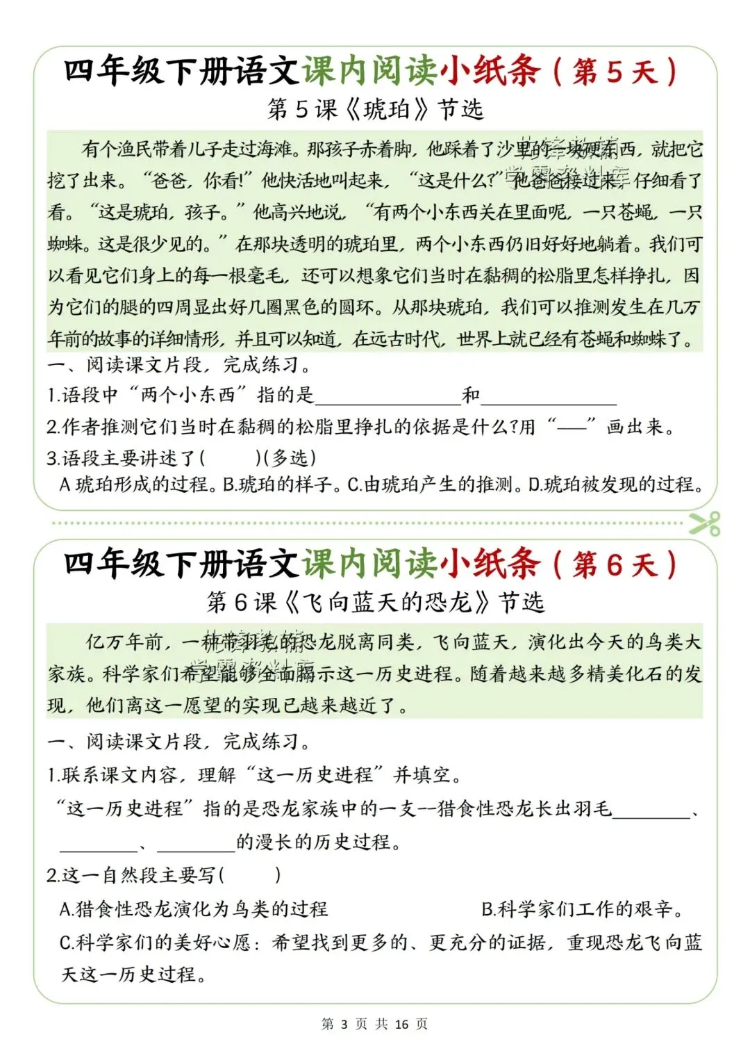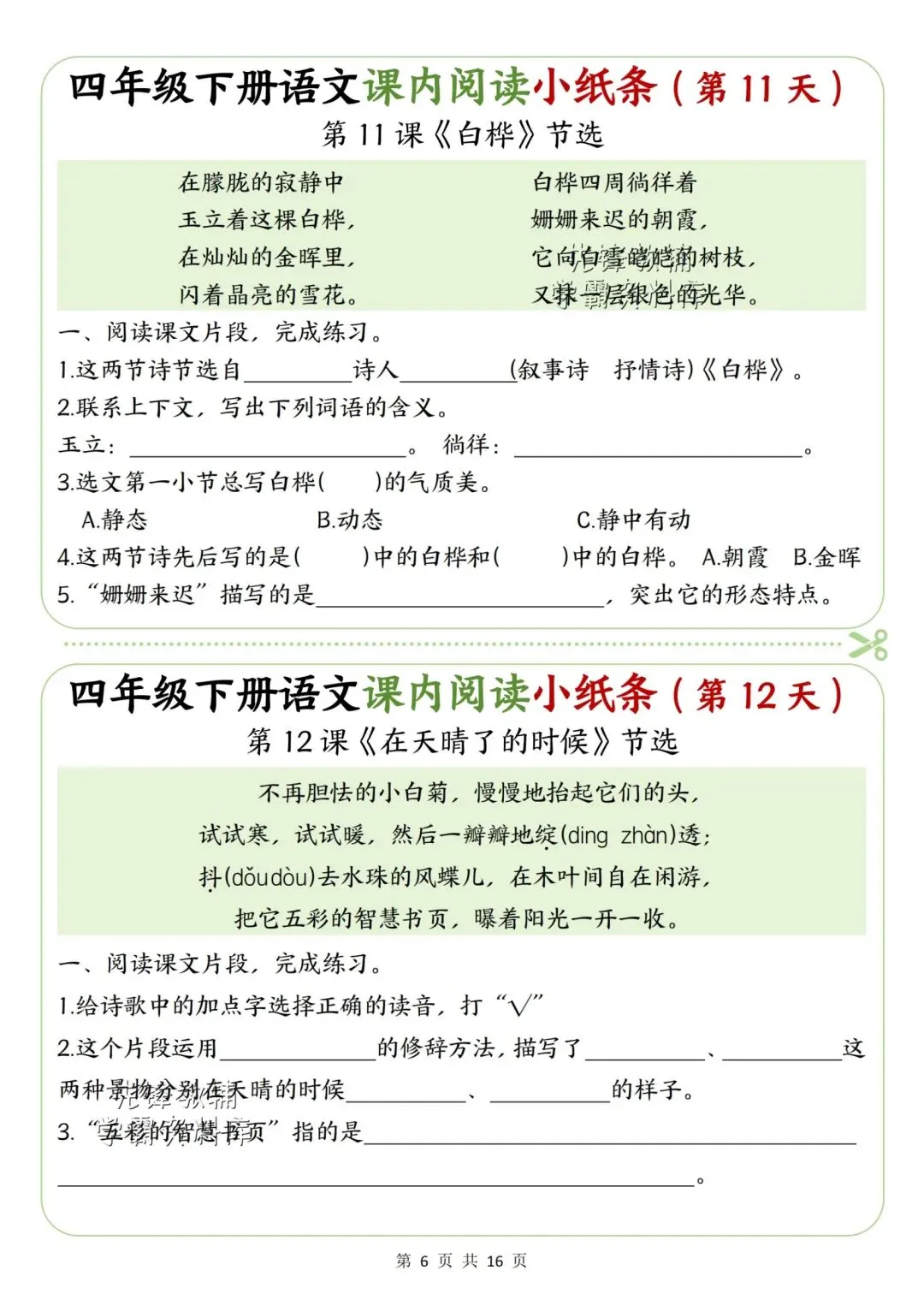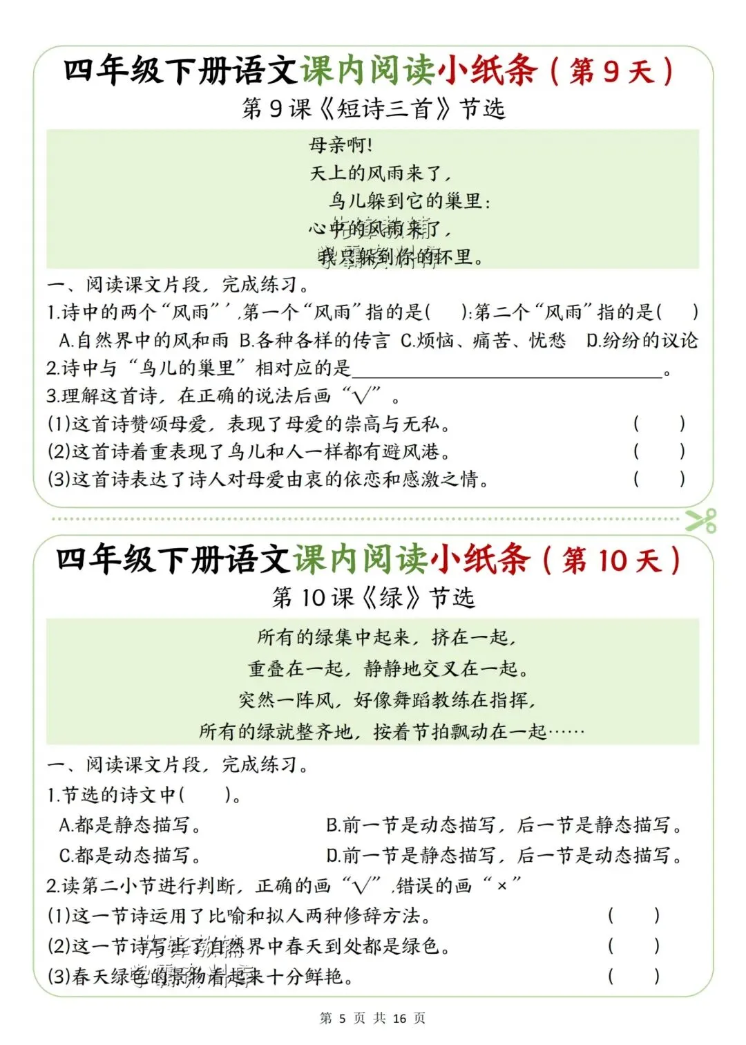 新版四年级下册语文课内阅读小纸条高清电子版可打印