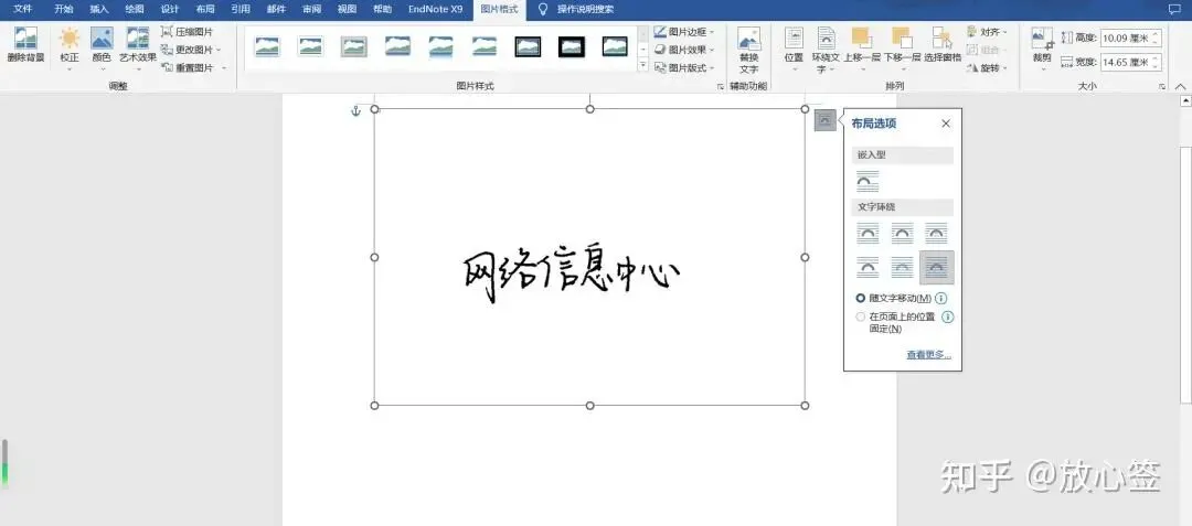 单击图片边上的「布局选项」,将图片格式设为「浮于文字上方」,此时图片处于可以被随意移动的状态。